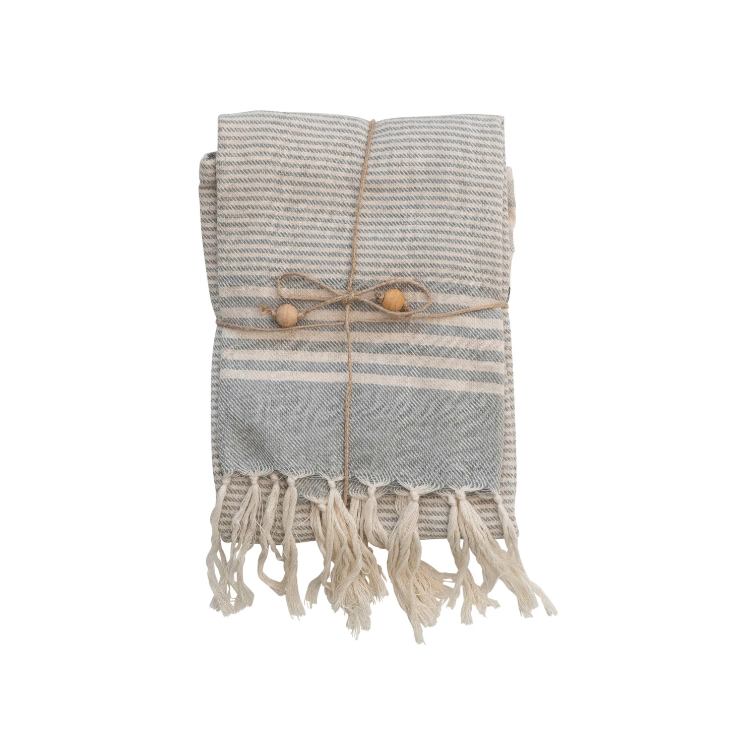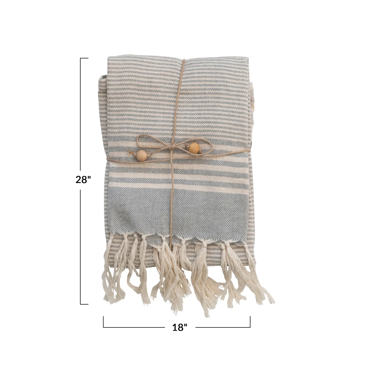 Featuring a vast selection of lush woven textures, intricate details, and timeless patterns, our collection of kitchen textiles will bring warmth and elegance to a dining space of any style. Instantly transform a breakfast nook or dining room into a sophisticated sanctuary by exploring a vast array of textiles and accessories fit for any space including table runners, napkin sets, placemats, napkin rings, tea towels, dish cloths, sponge cloths, pot holders, food pouches, aprons, and so much more. Choose from a wide variety of luxurious fabrics from cotton and velvet to linen and seagrass, and styles from mid-century modern and boho to classic farmhouse and contemporary. This casual set of cotton tea towels features a striped pattern and decorative fringe tied with a jute and wood bead tie. Display in a living or dining space of any style from farmhouse to cottage. Machine Wash Warm, Gentle Cycle, Do Not Bleach, Tumble Dry Low, Warm Iron If Needed. Made from cotton.