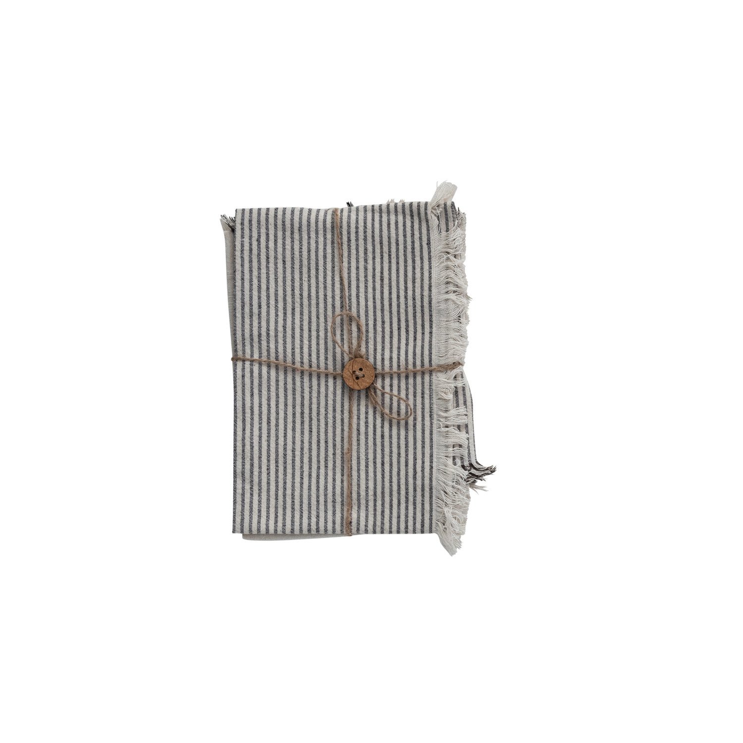 Catalog Name: 28"L x 18"W Woven Cotton Tea Towels w/ Stripes & Fringe, Natural & Black, Set of 2 Tied w/ Jute & Wood Button