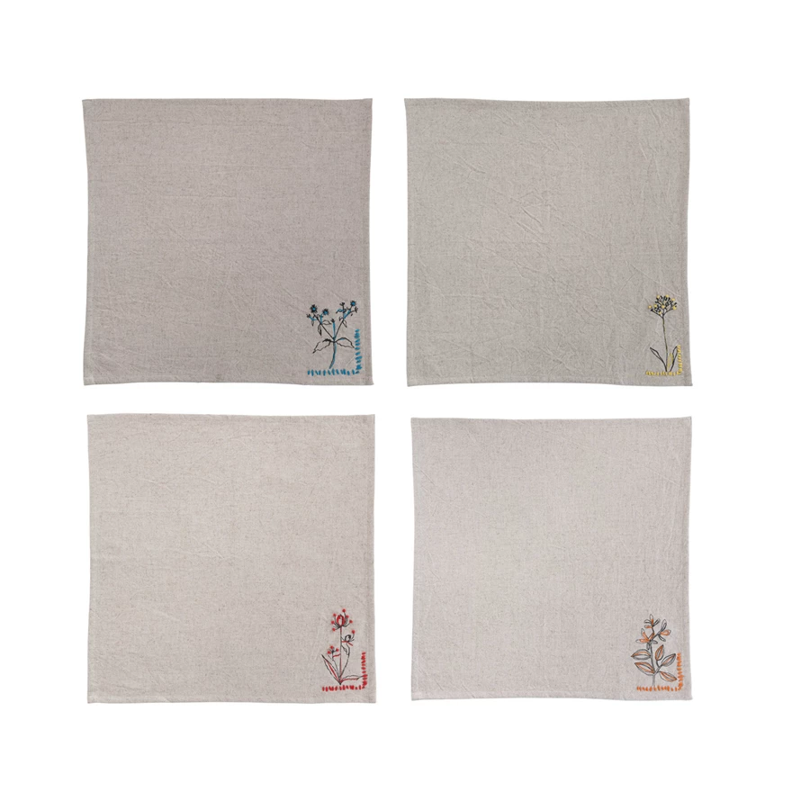 Cotton Printed Napkins w/ Hand-Embroidery & French Knots, 4 Styles, Set of 4 ©