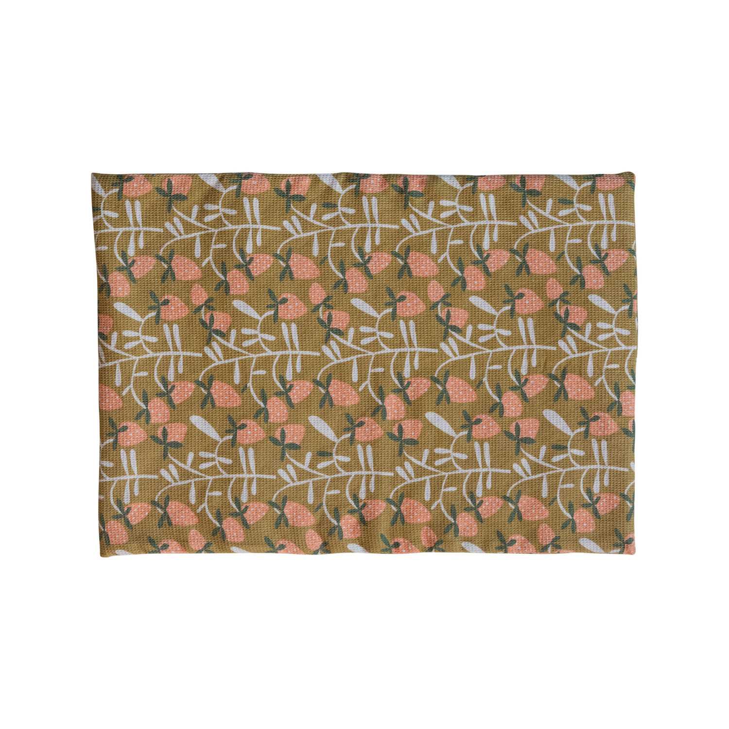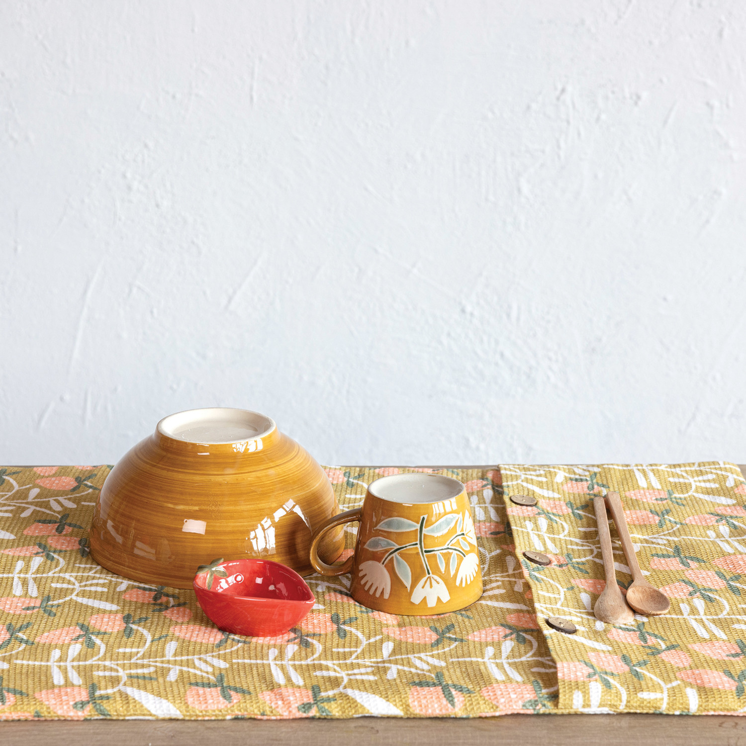 This dish drying mat is not just a practical kitchen item but also a charming addition to any space. It features a quilted terry cloth insert for extra cushioning and protection, while the outer layer is made of pure cotton with a strawberry pattern. The mat also features three coconut shell buttons for easy storage. This drying mat is perfect for drying dishes, pots, and pans, or showcasing bakeware and serveware, adding a touch of farmhouse, French country, boho, or Scandinavian style to the home. This is a beautiful and fun piece that will add some beauty and freshness to the table setting.