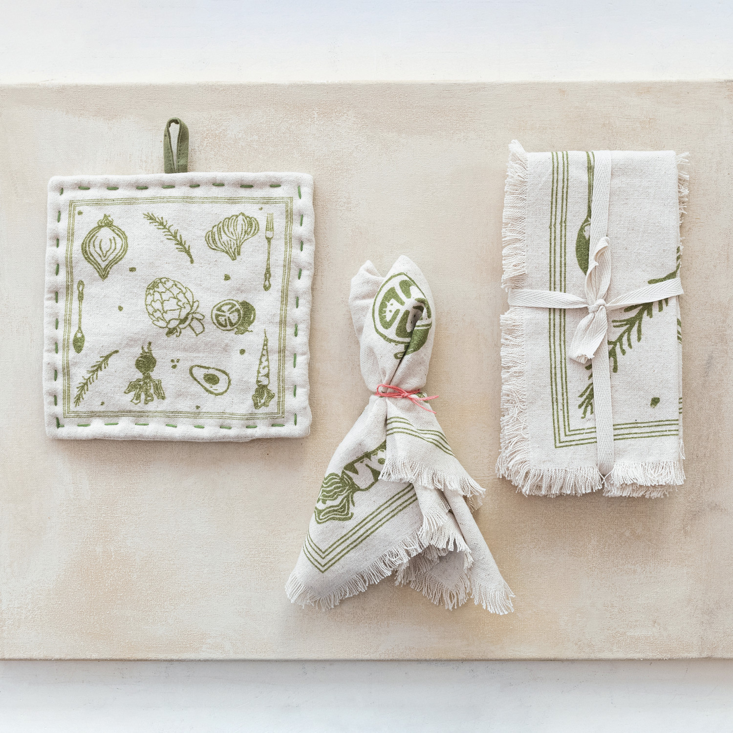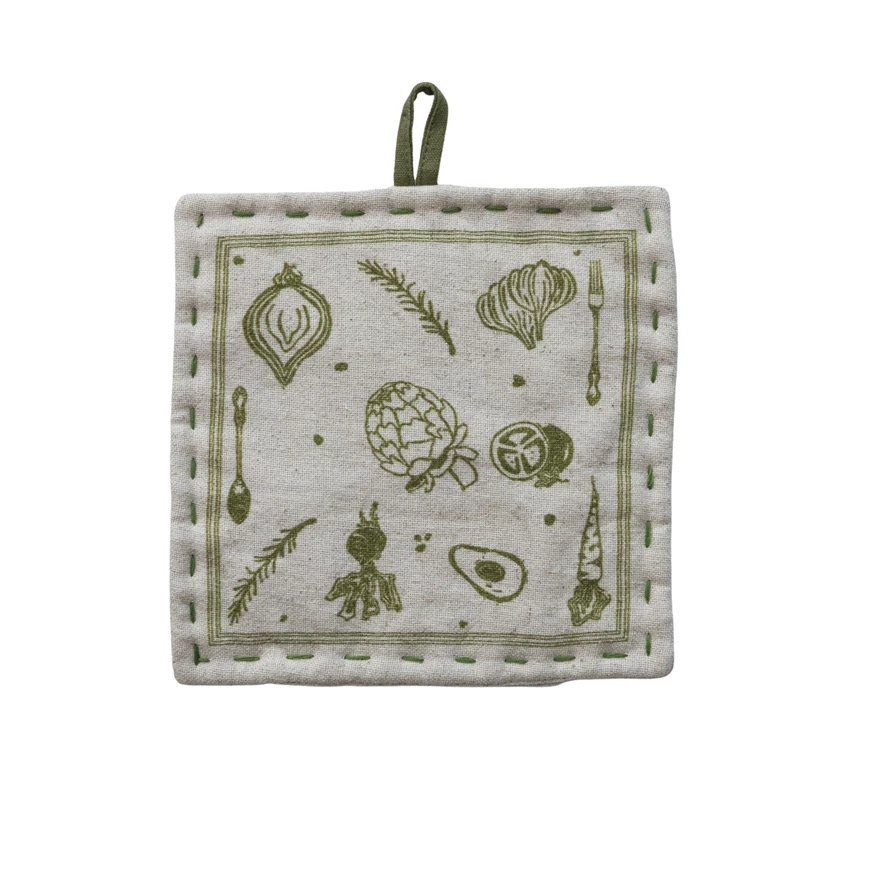Catalog Name: 8" Square Cotton & Linen Printed Pot Holder w/ Vegetable/Cutlery Pattern & Hand-Embroidered Kantha Stitch, Natural & Green