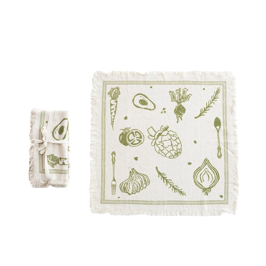 Cotton & Linen Printed Napkins w/ Vegetables, Cutlery & Fringe, Set of 4