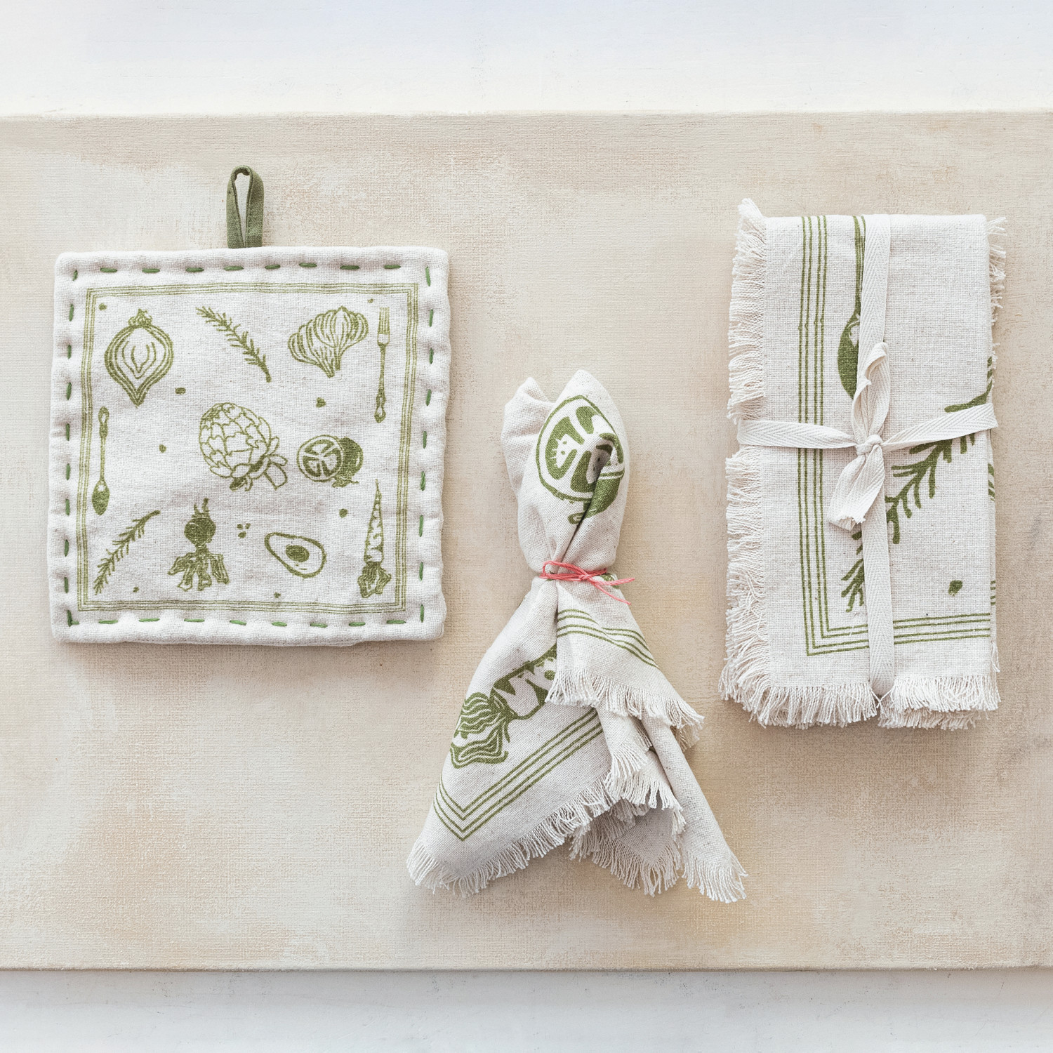 Catalog Name: 18" Square Cotton & Linen Printed Napkins w/ Vegetable/Cutlery Pattern & Fringe, Natural & Green, Set of 4 Tied w/ Cotton Tape
