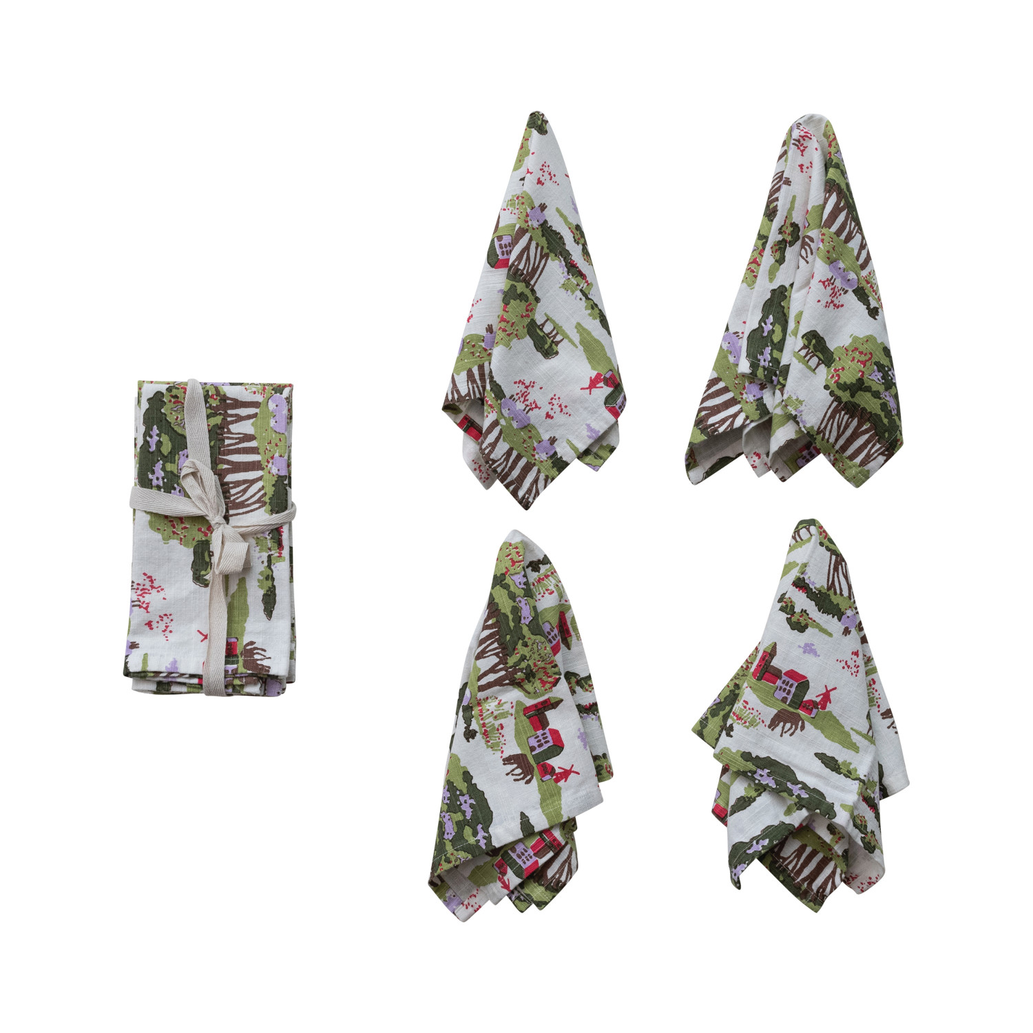Catalog Name: 18" Square Cotton Printed Napkins w/ Farm Landscape, Multi Color, Set of 4 Tied w/ Cotton Tape