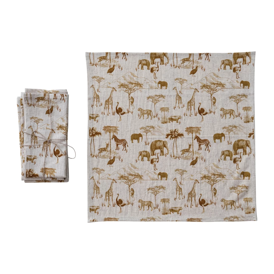 Catalog Name: 18" Square Cotton & Linen Printed Napkins w/ Safari Animals Pattern, Natural & Brown, Set of 4 Tied w/ Jute
