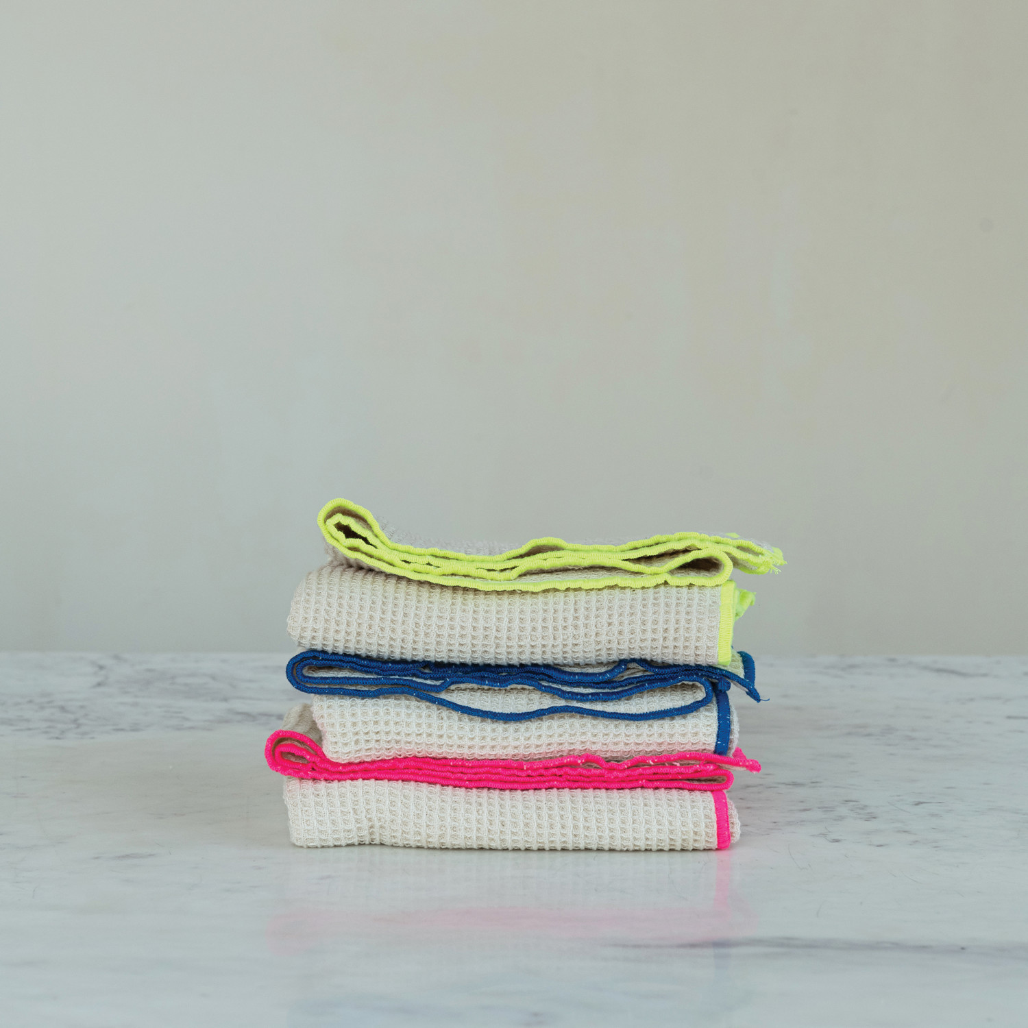 Cotton Blend Waffle Weave Tea Towel with Neon Trim, 3 Colors