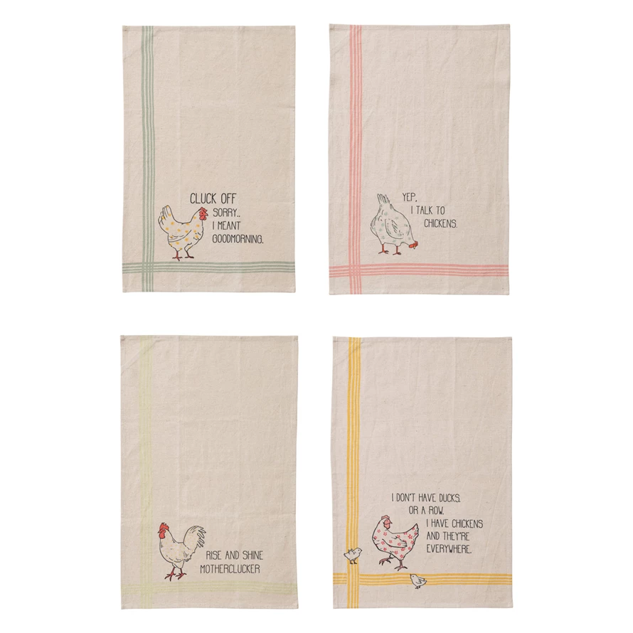 Cotton & Linen Printed Tea Towel w/ Chicken & Saying, 4 Styles