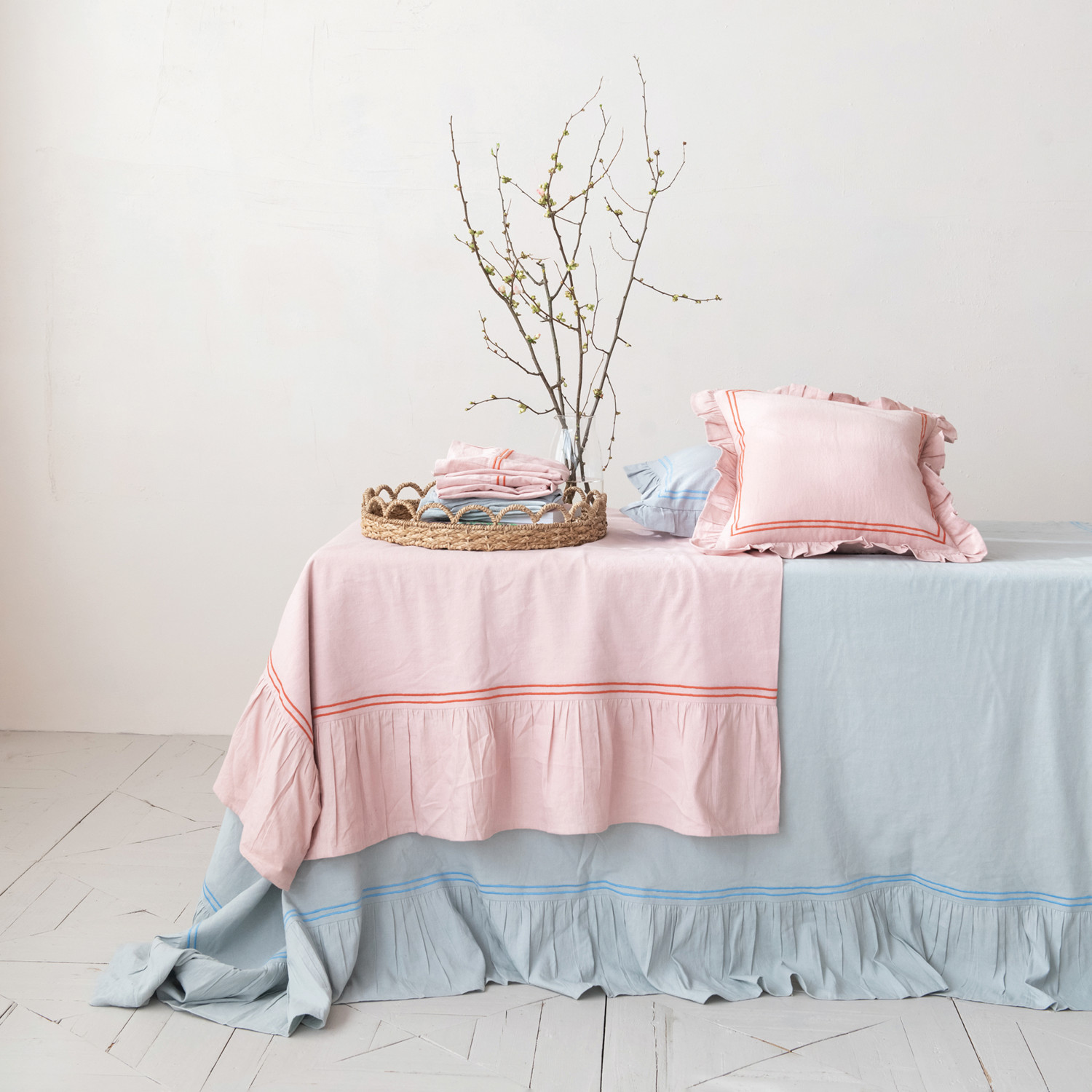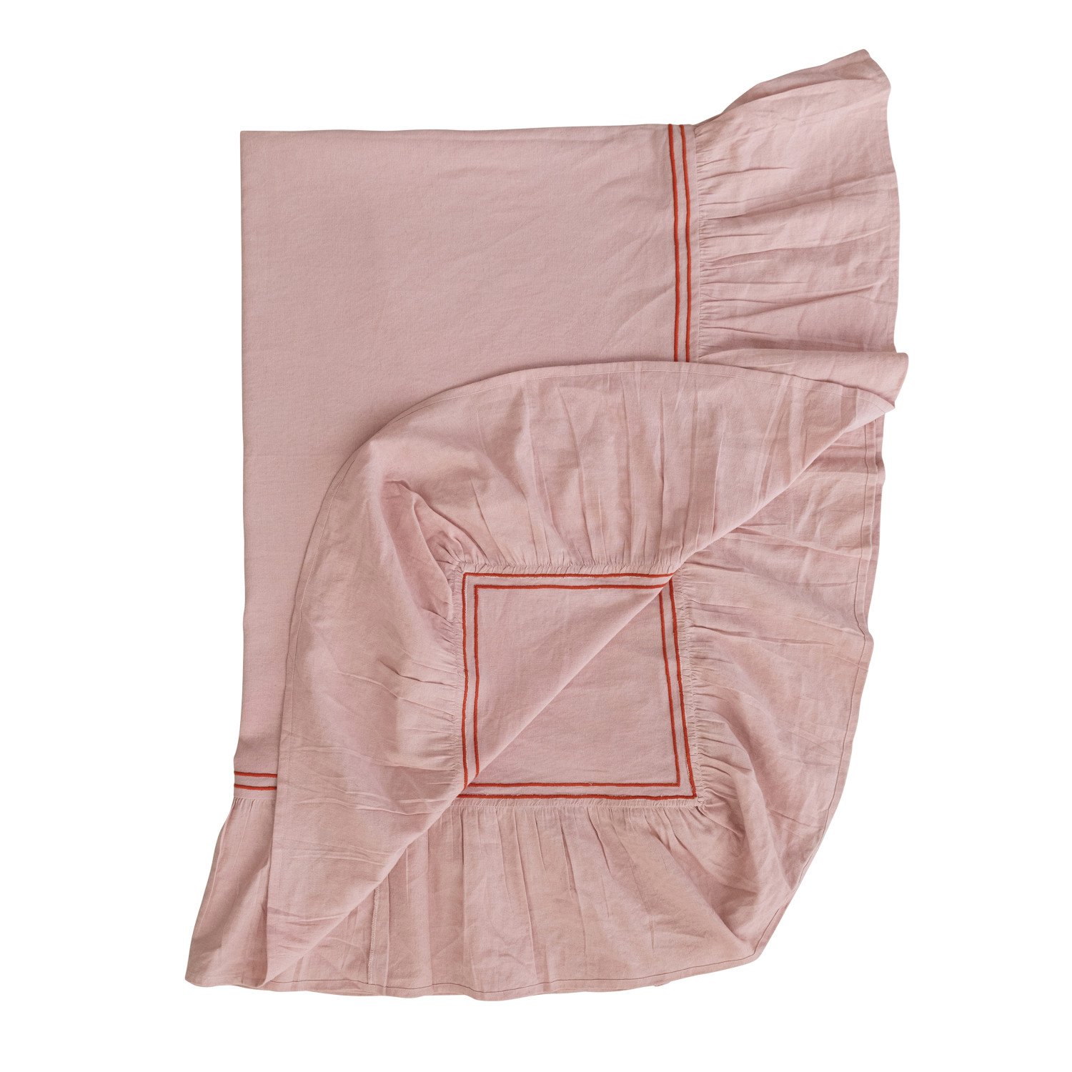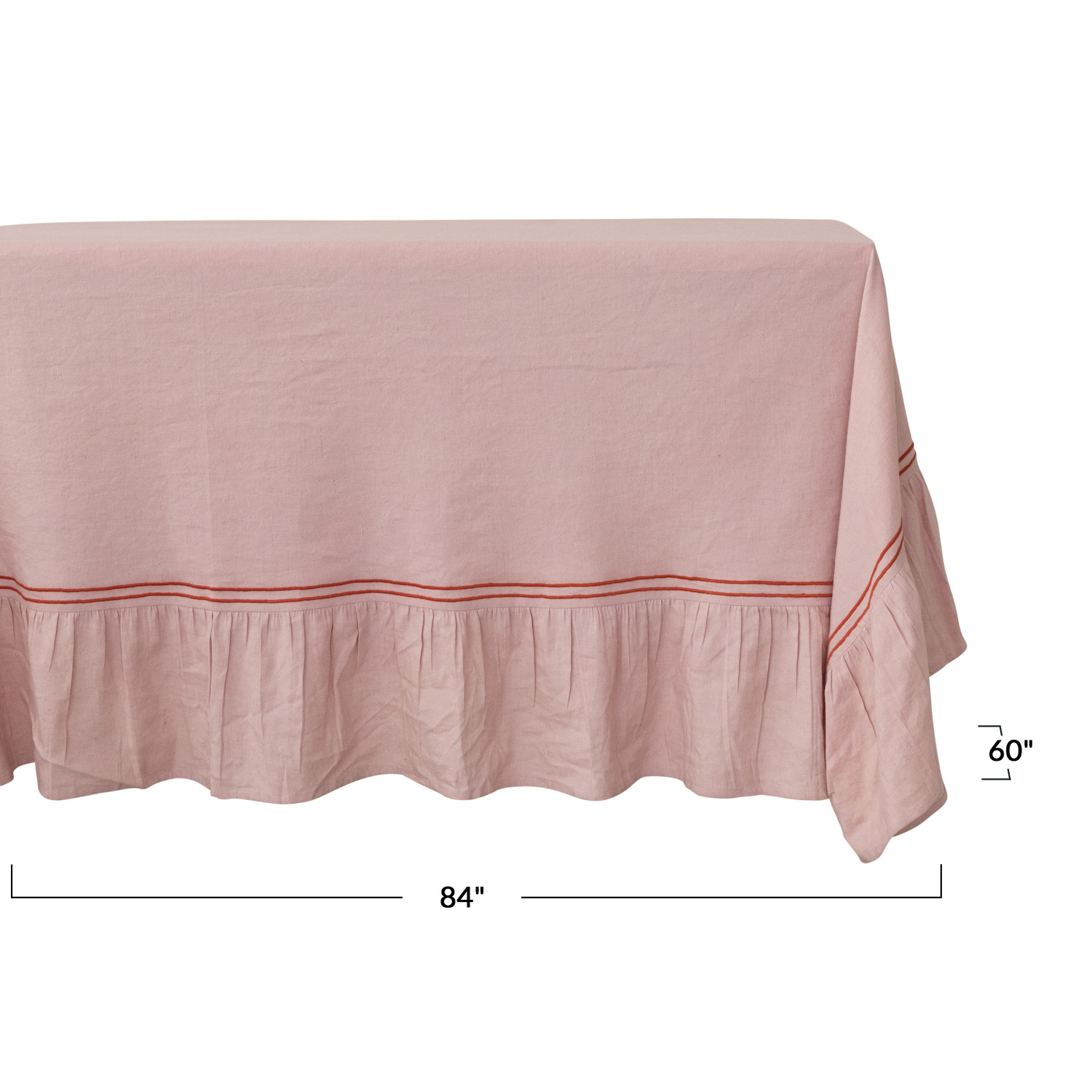 Cotton & Linen Tablecloth w/ Embroidered Trim & Ruffled Edge, Pink & Coral Color