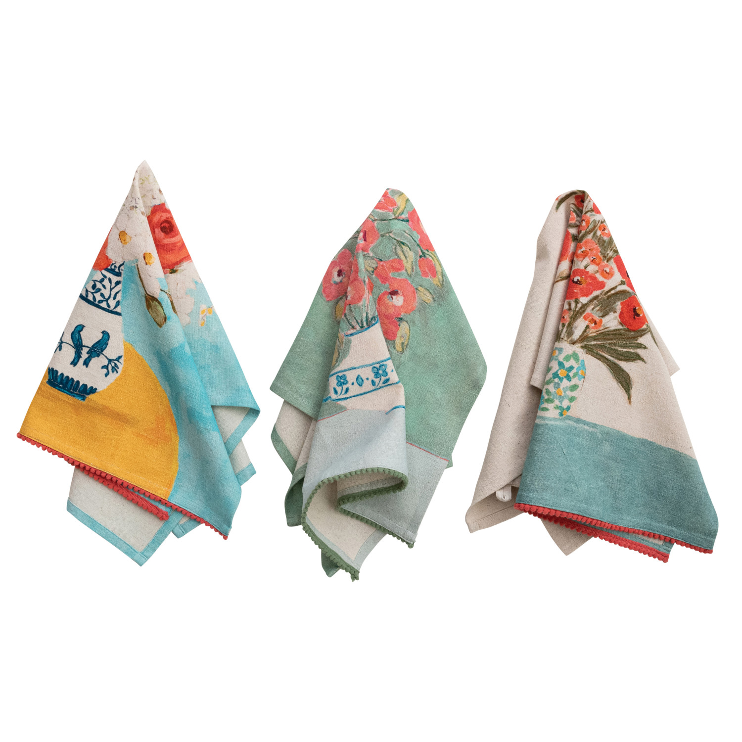 Cotton & Linen Printed Tea Towel w/ Flowers in Vase & Mini Pom Pom Trim, 3 Styles ©
