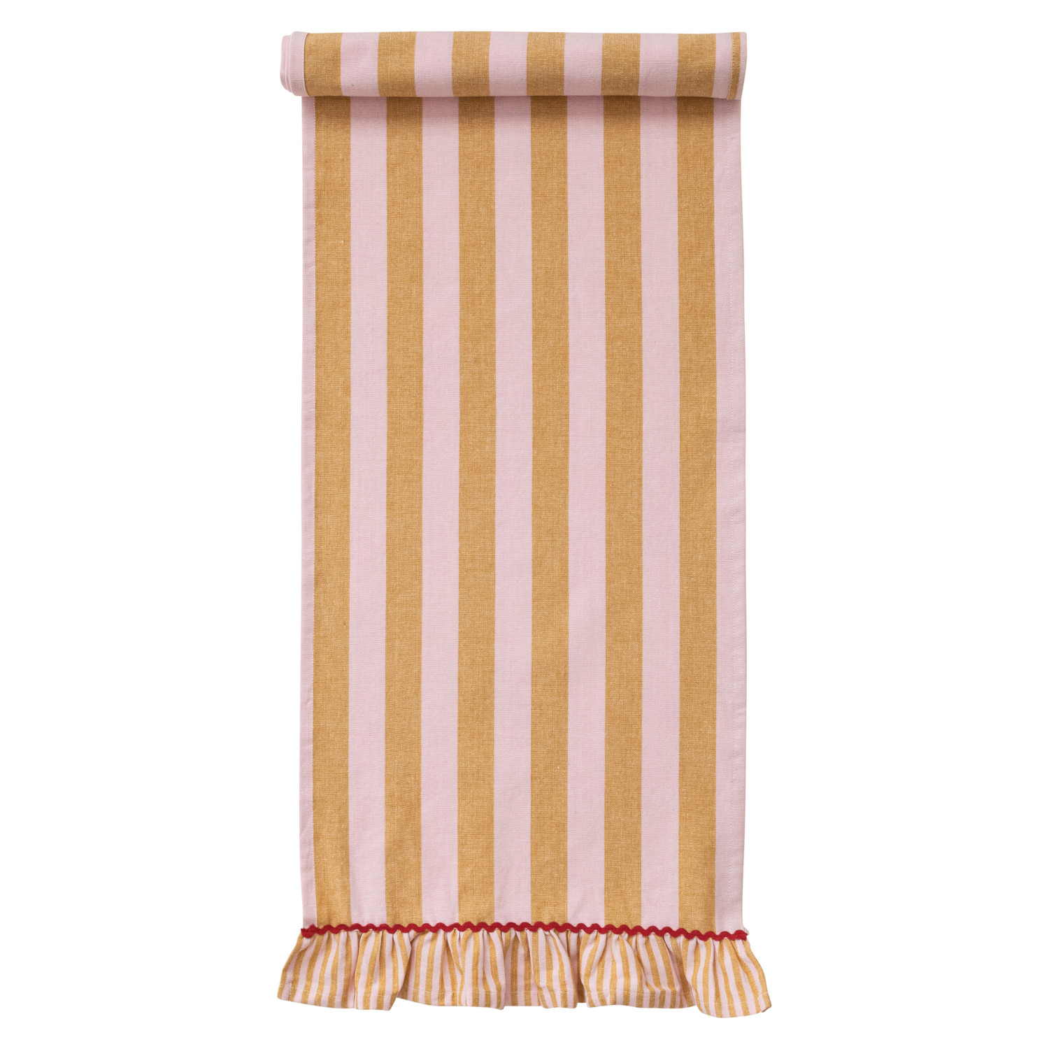 Catalog Name: 72"L x 14"W Woven Cotton Striped Table Runner w/ Ruffle & Ric Rac Trim, Mustard Color, Pink & Red