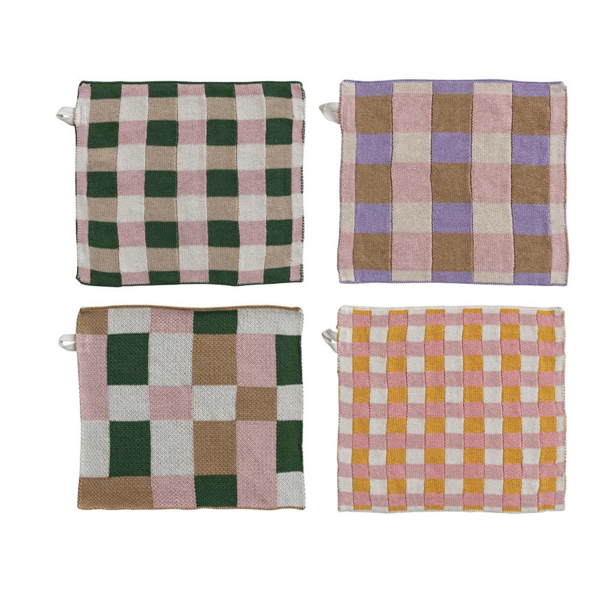 Cotton Knit Dish Cloth with Check/Plaid Pattern, 4 Styles