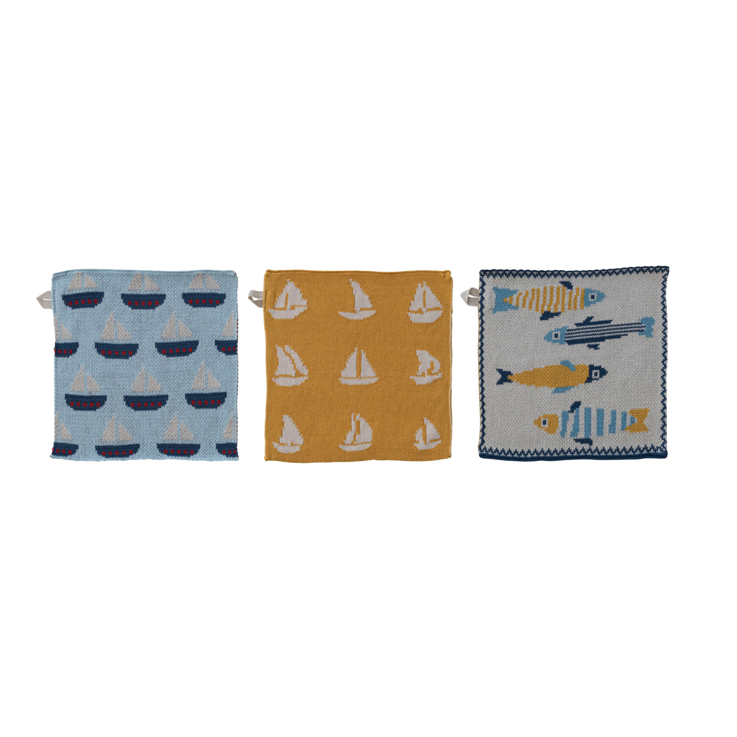 Catalog Name: 10-1/2" Square Cotton Knit Dish Cloth w/ Fish/Boat Pattern, Multi Color, 3 Styles
