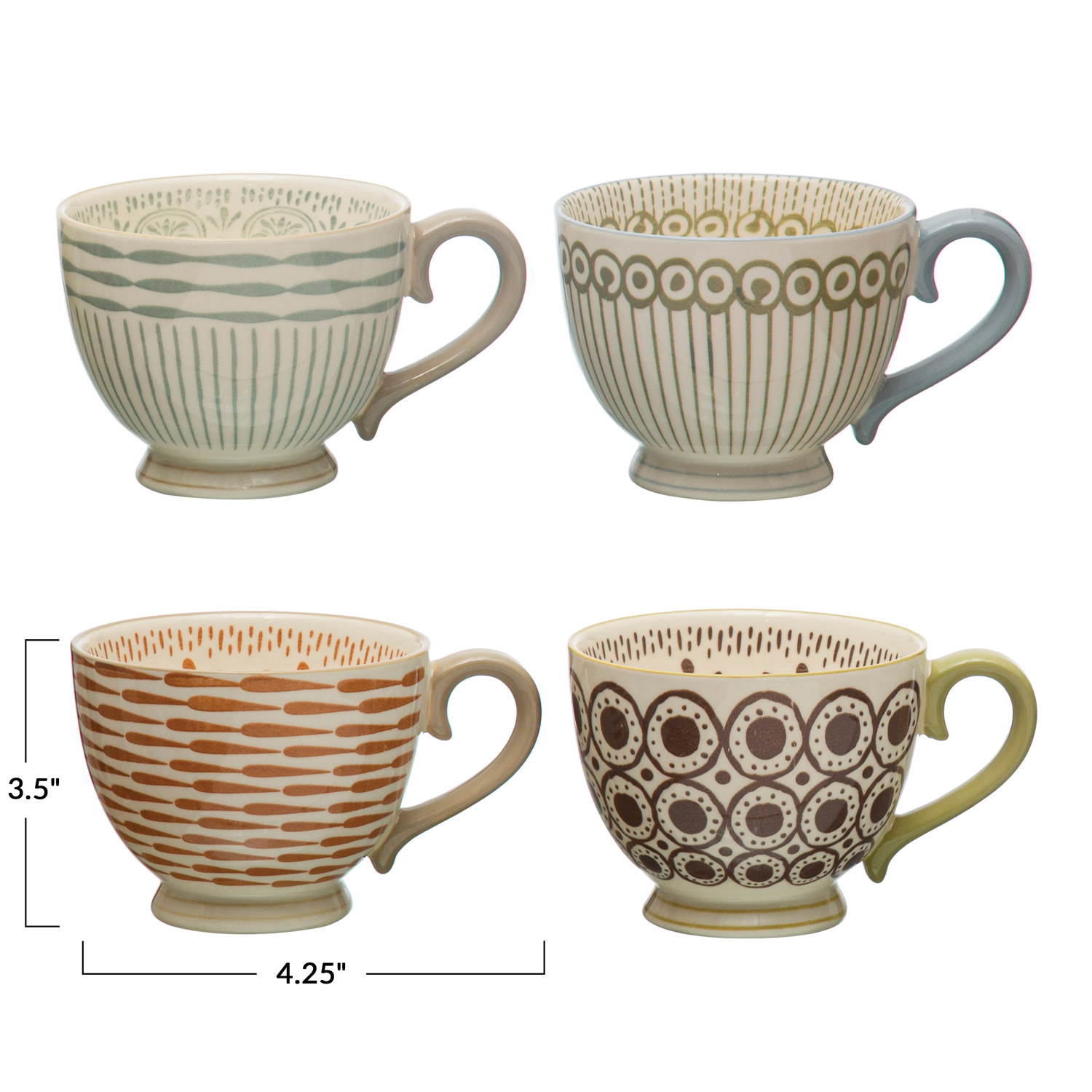 Catalog Name: 4-1/4" Round x 3-1/2"H 10 oz. Hand-Painted Stoneware Mug w/ Pattern, Multi Color, 4 Styles