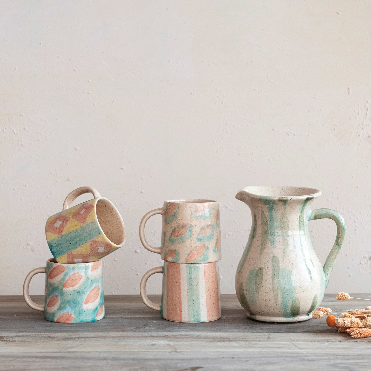 Catalog Name: 4-1/4" Round x 4-1/4"H 20 oz. Hand-Painted Terra-cotta Mug w/ Pattern, Crackle Glaze, Multi Color, 4 Styles (Each One Will Vary)