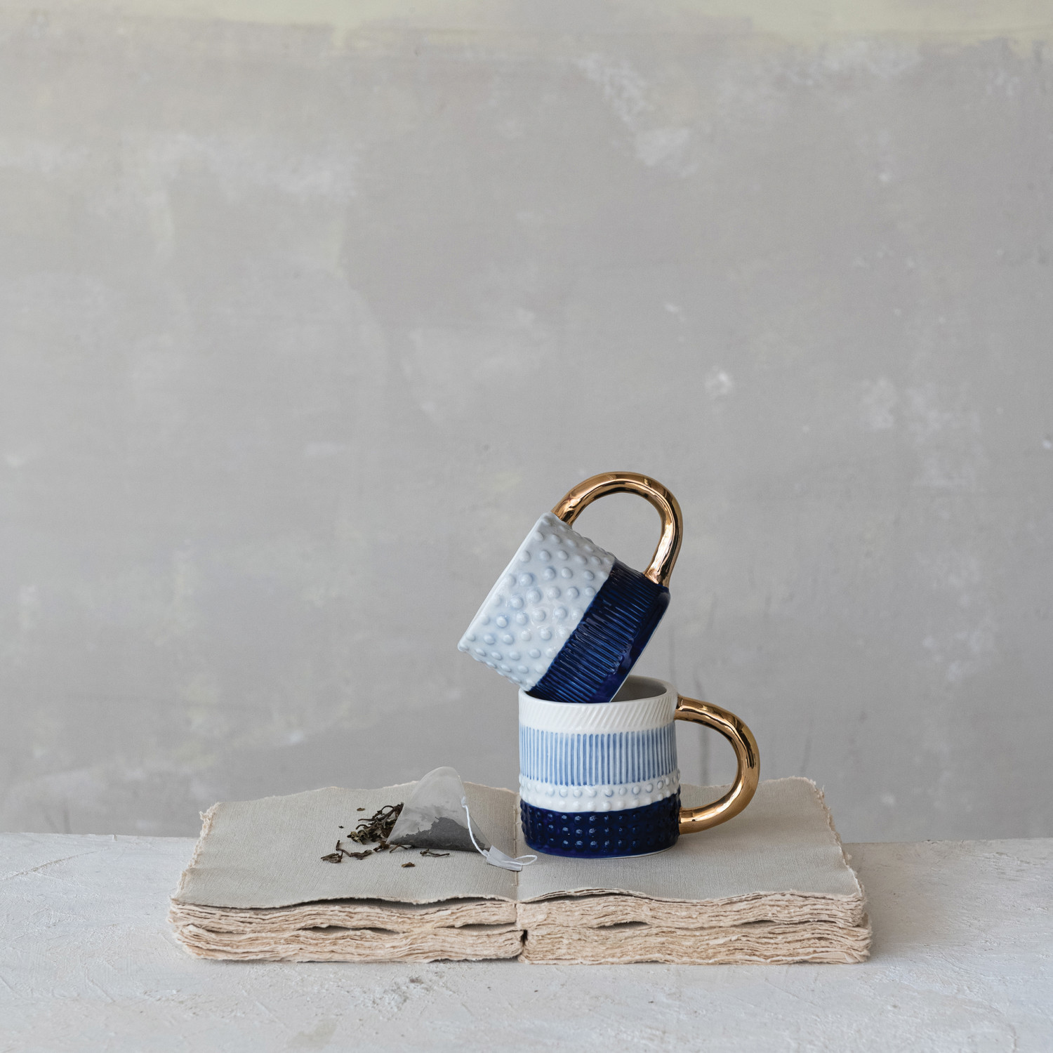 Catalog Name: 3-1/2" Round x 3-1/4"H 14 oz. Handmade Stoneware Mug w/ Embossed Pattern & Gold Electroplated Handle, Blue & White, 2 Styles ©