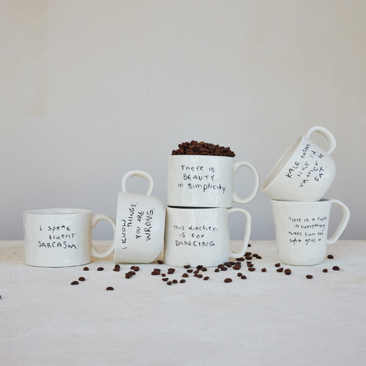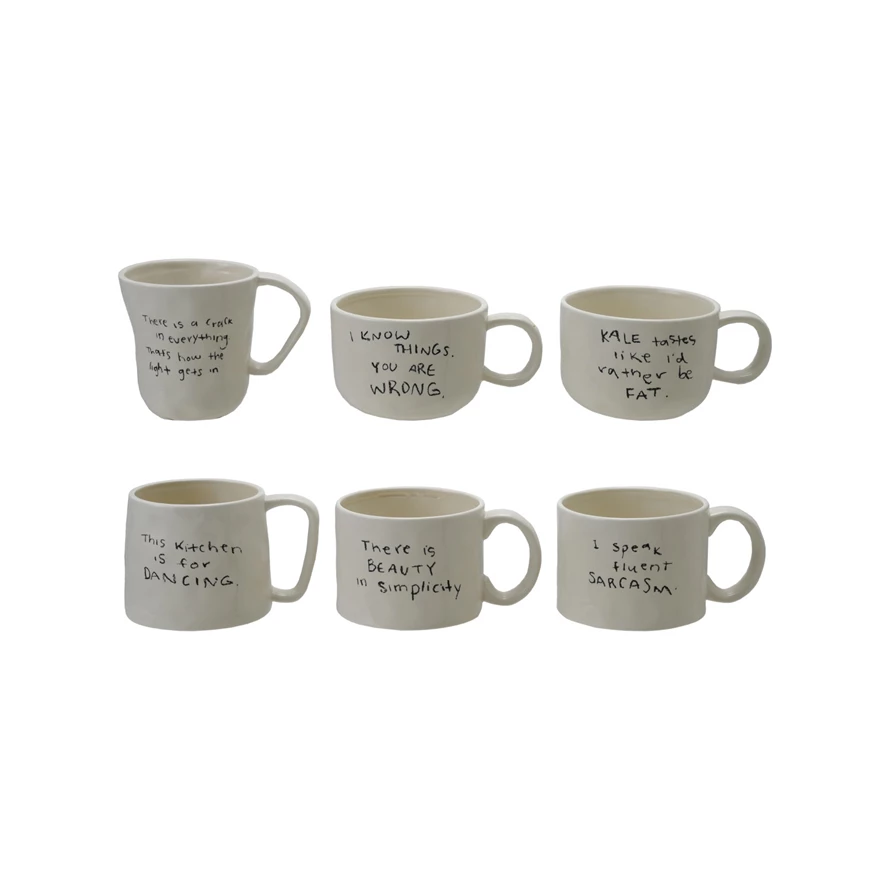 12 oz. Stoneware Mug with Saying, White & Black, 6 Styles