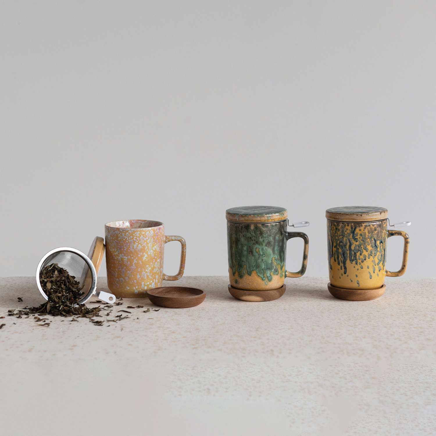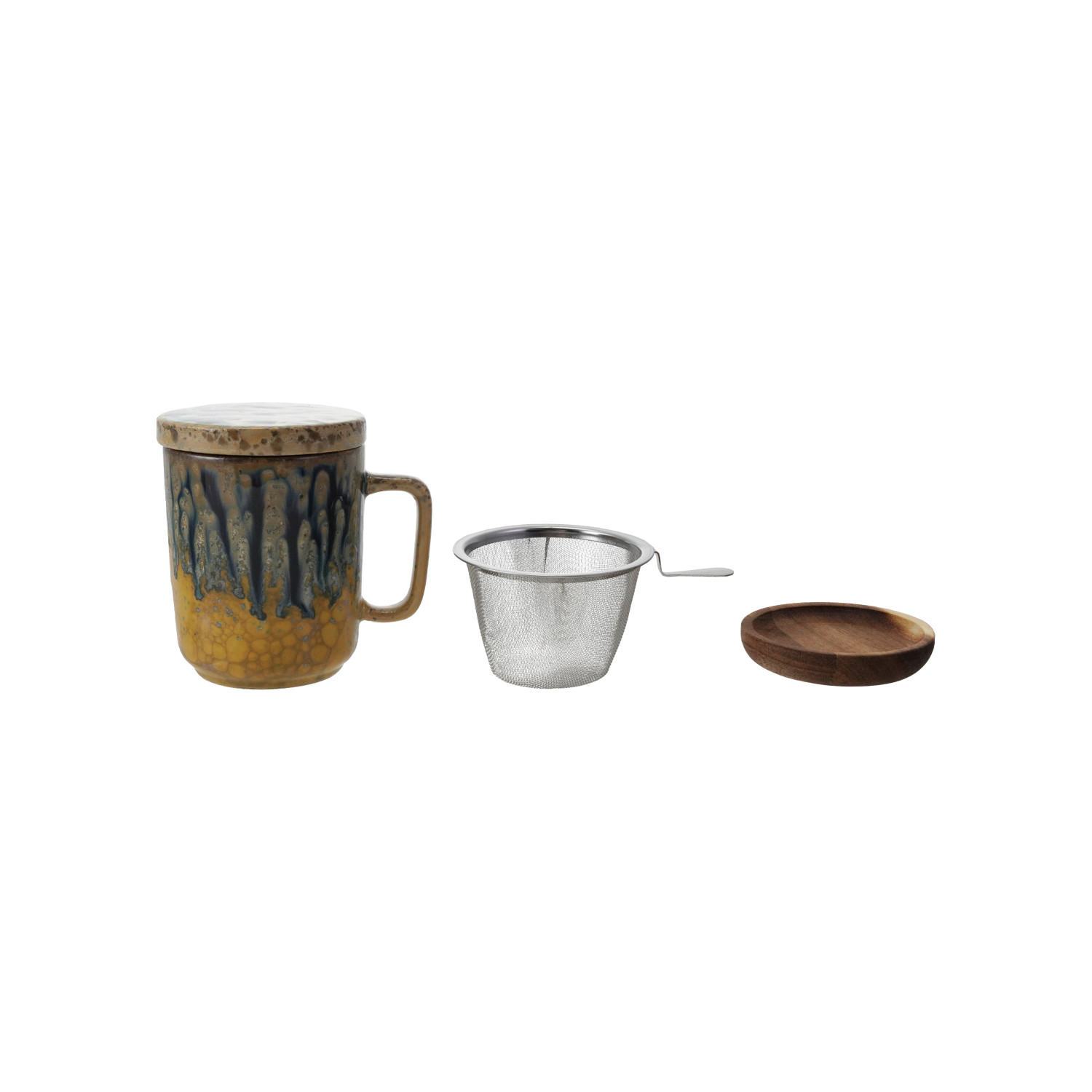 Catalog Name: 3-1/4" Round x 4-1/2"H 10 oz. Stoneware Mug w/ Metal Strainer, Lid & Acacia Wood Saucer, Reactive Glaze, Set of 3, 3 Styles (Each One Will Vary)