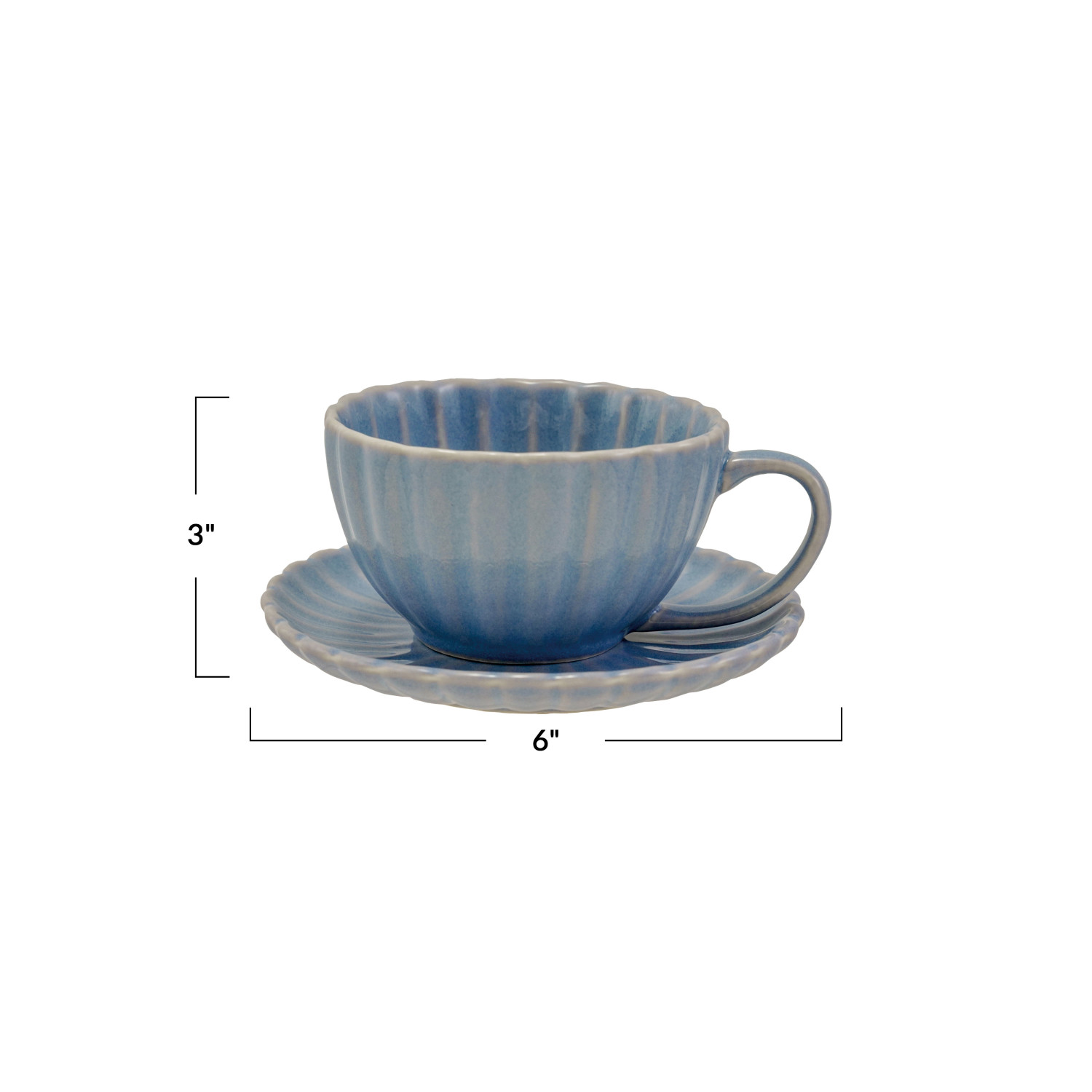 Catalog Name: 6" Round x 3"H 10 oz. Stoneware Ribbed Mug w/ Saucer, Reactive Glaze, Light Blue, Set of 2 (Each One Will Vary)