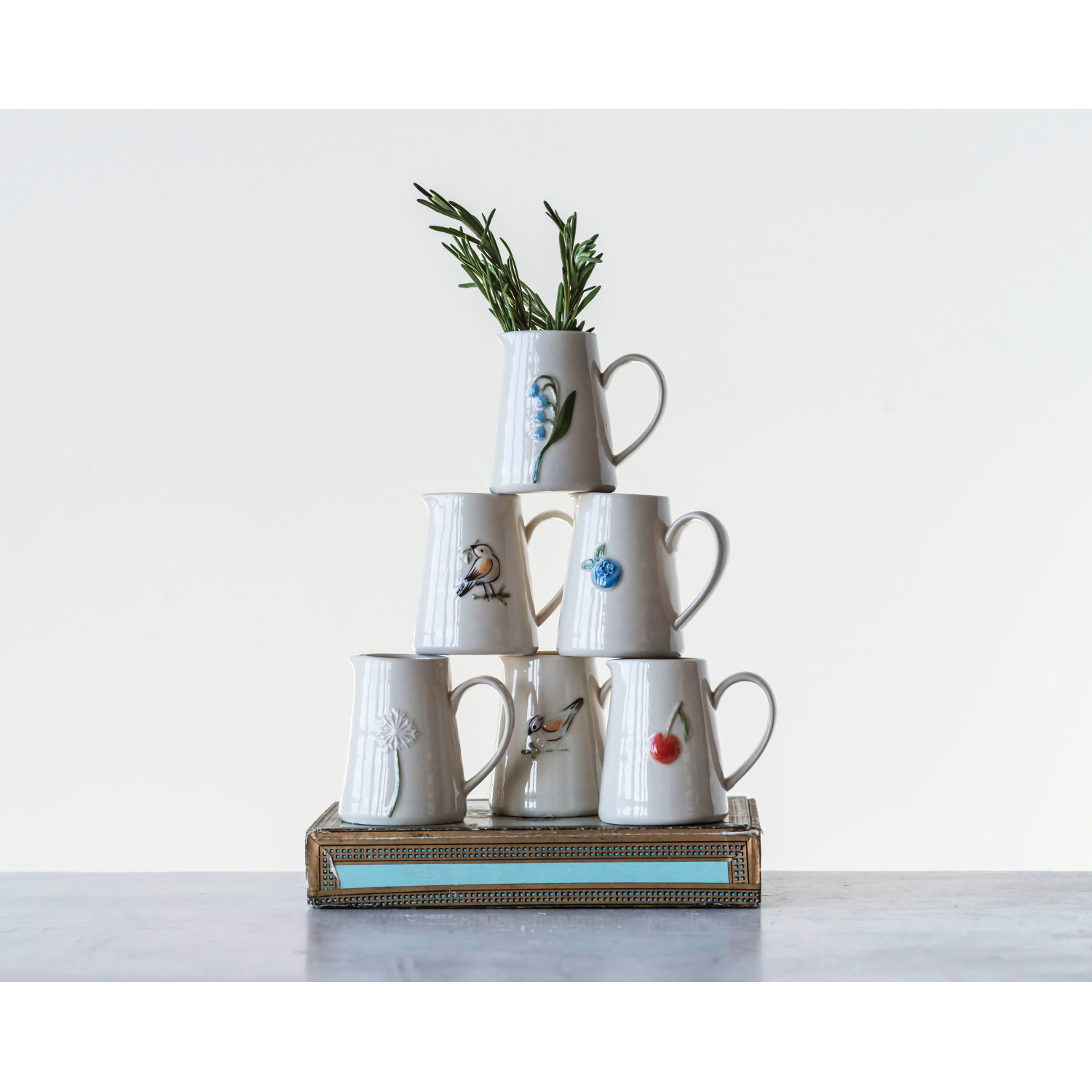 Catalog Name: 3-1/4"L x 2-1/2"W x 3"H 6 oz. Hand-Painted Embossed Stoneware Creamer, Multi Color, 6 Styles
