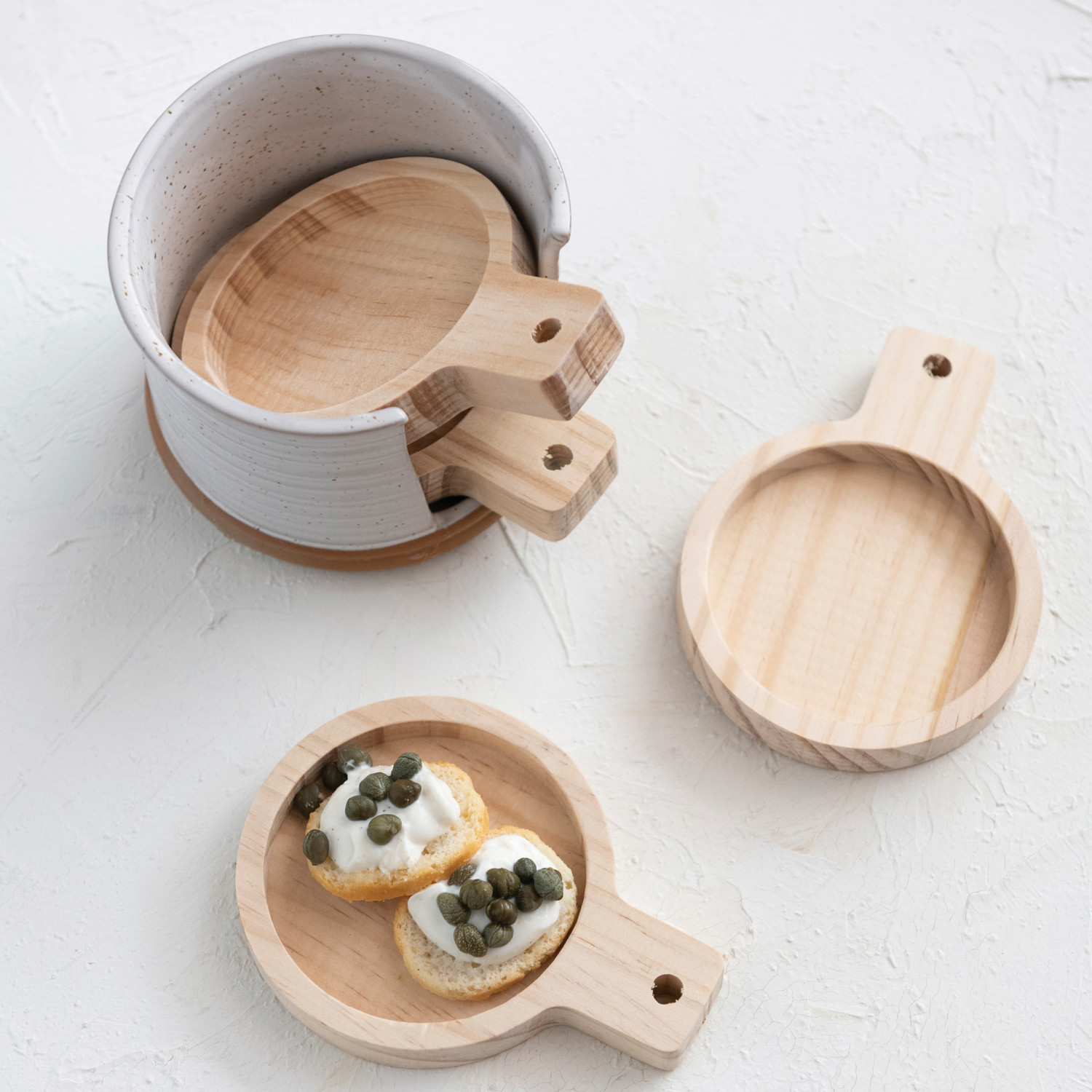 Catalog Name: 4-1/2"L x 4-1/4"W x 3-1/4"H Pine Wood Tapas Plates w/ Stoneware Holder, Reactive Glaze, Natural, White & Terra-cotta Color, Set of 5 (Each One Will Vary)