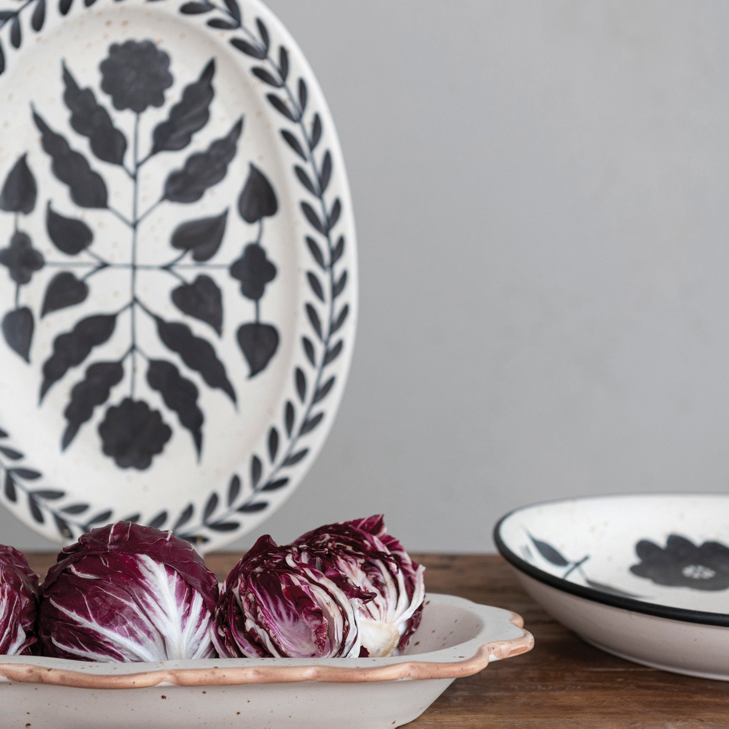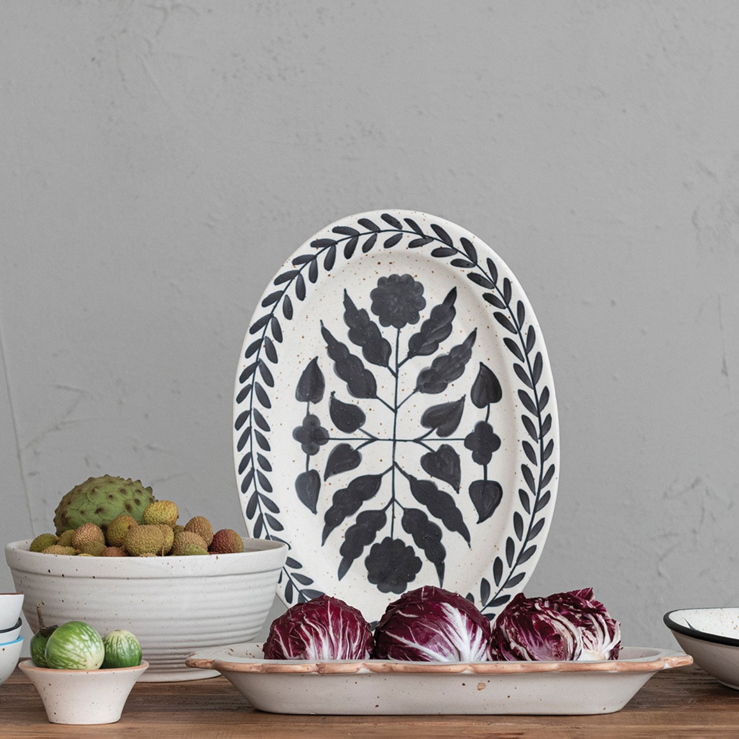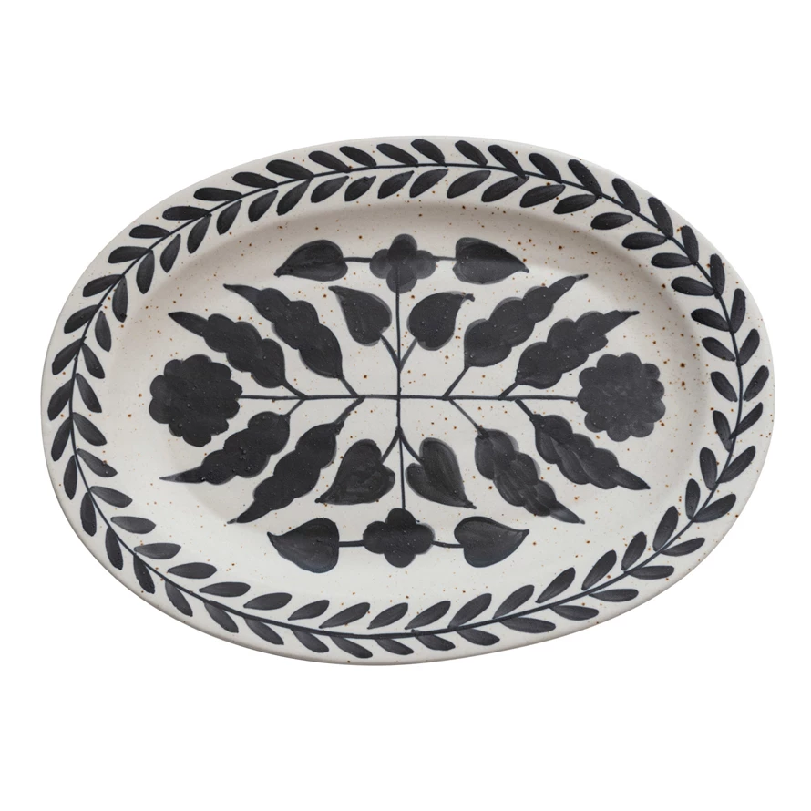 Catalog Name: 18"L x 13"W x 2"H Hand-Painted Stoneware Platter w/ Floral Design, Matte Black & Cream Color Speckled