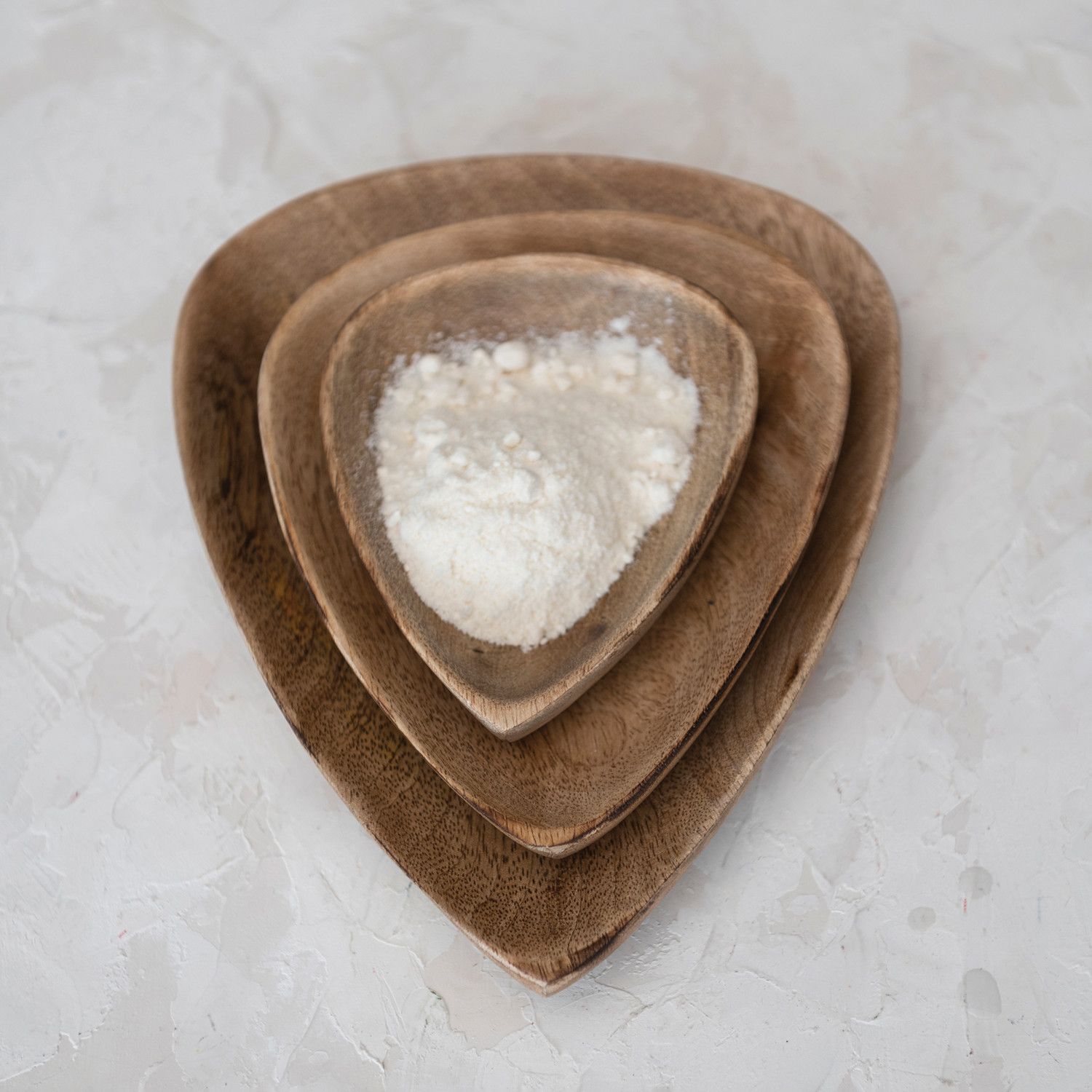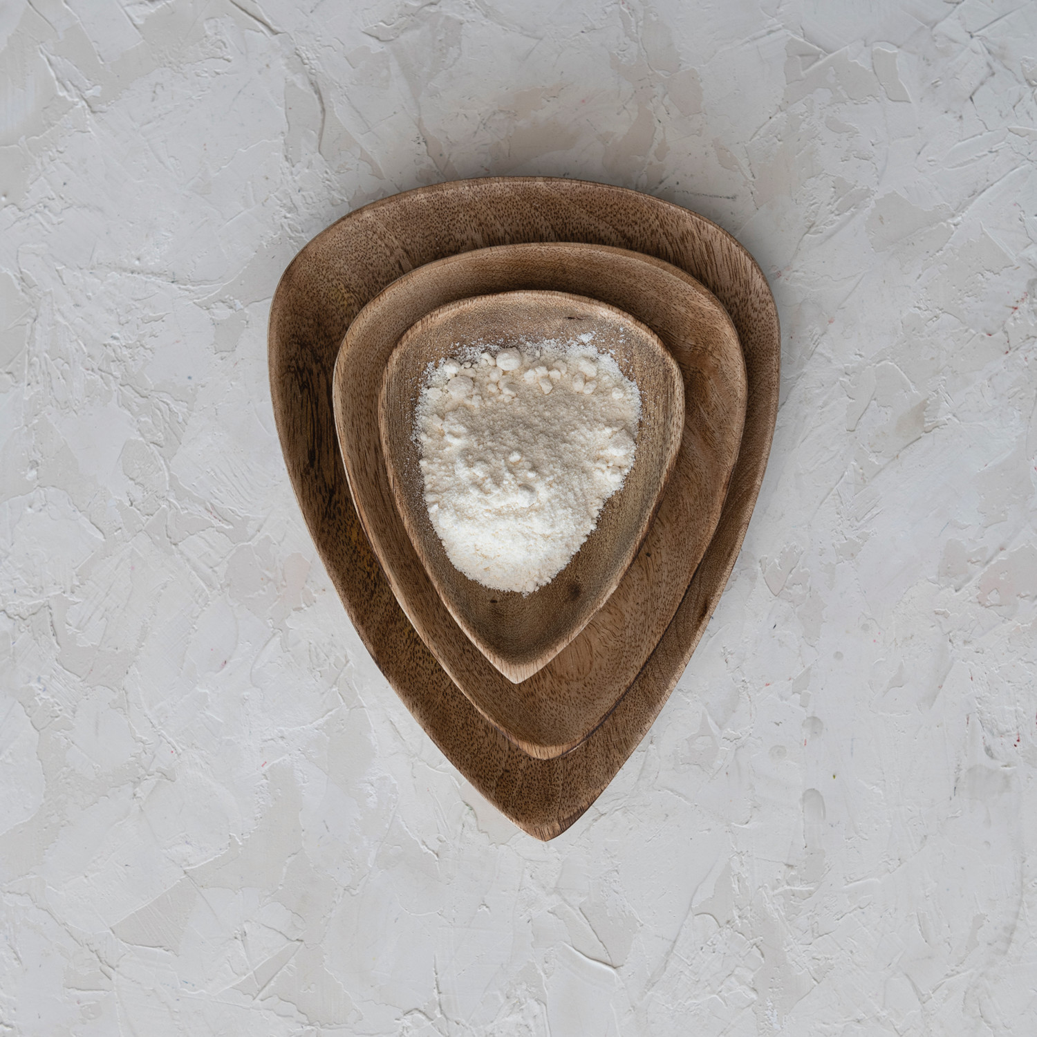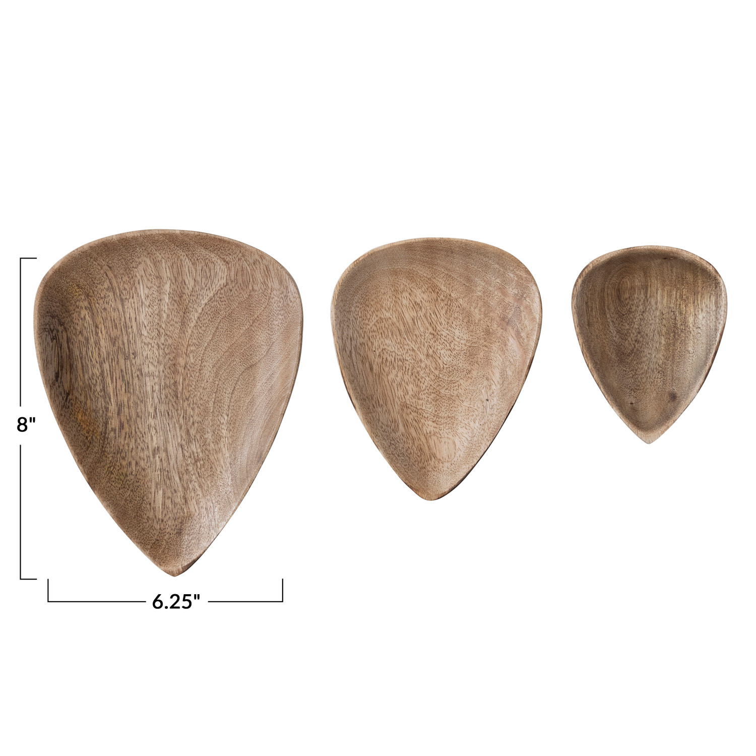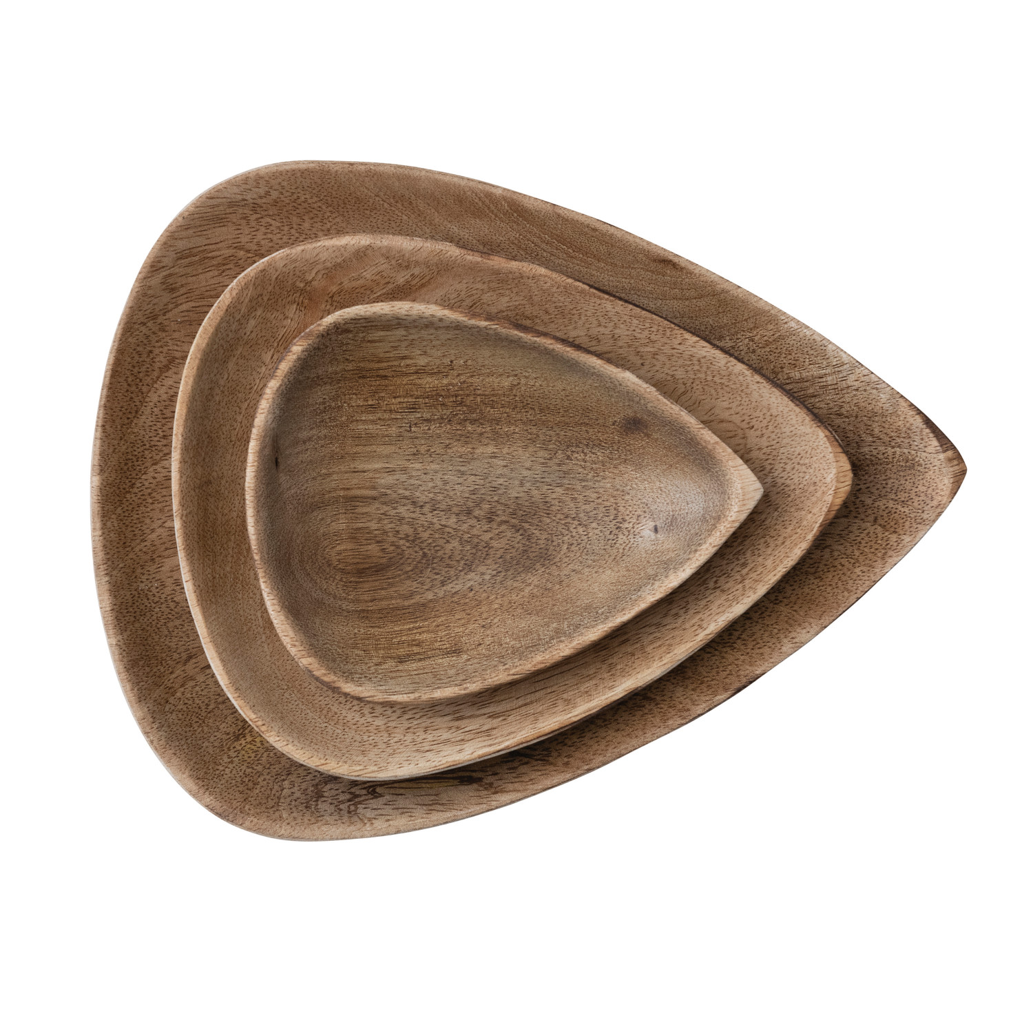 Catalog Name: 8"L x 6-1/4"W, 6-1/4"L x 4-3/4"W & 4-1/2"L x 3-1/2"W Mango Wood Triangular Trays/Plates, Natural, Set of 3