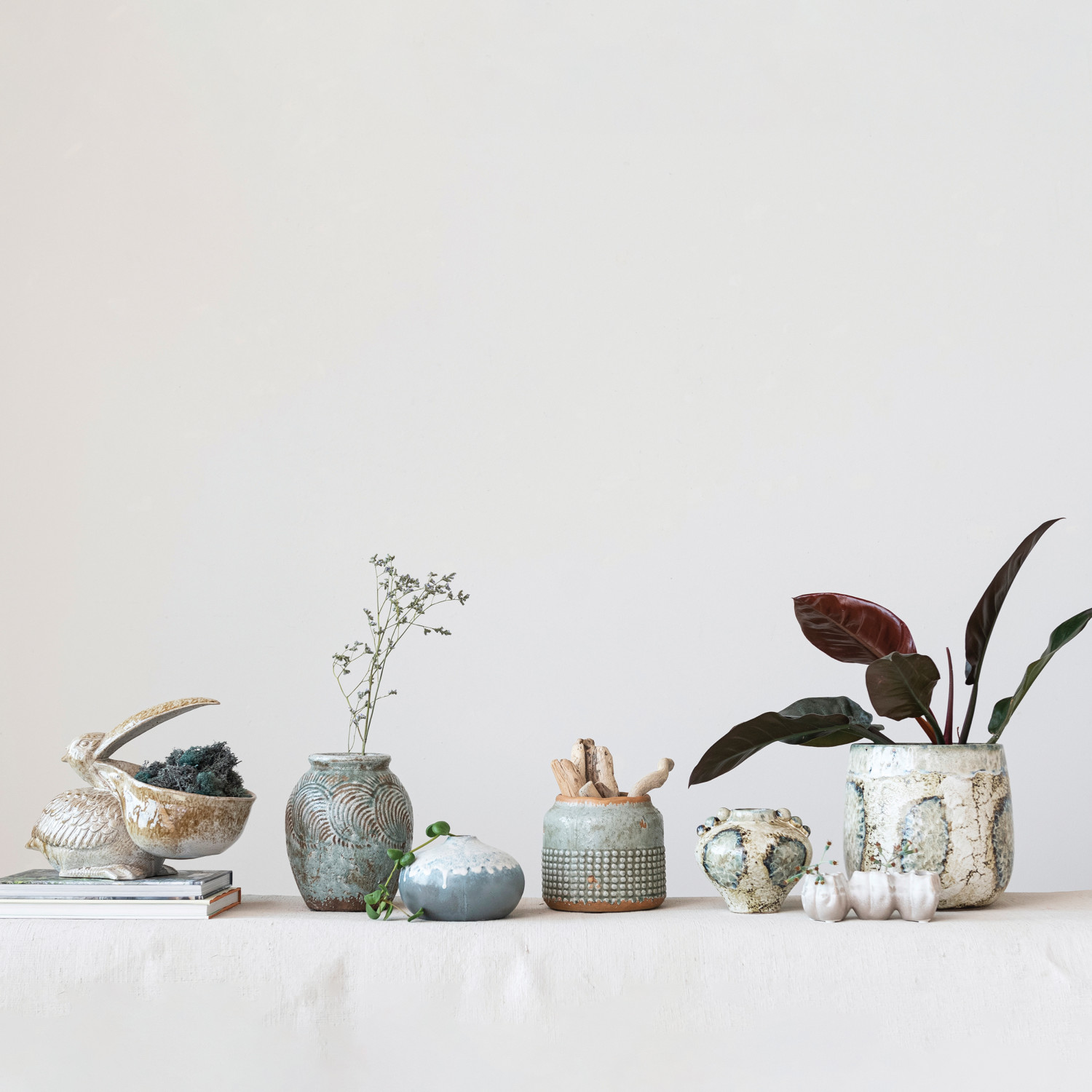 Our thoughtfully crafted collection of serve ware showcases an expansive selection of natural materials and artisanal silhouettes that are all intentionally designed for the modern host. Elevate gatherings of friends and family with an offering of stylishly versatile pieces including serving bowls, pitchers, platters, crocks, ladles, salt and pepper shakers, pinch pots, tiered trays, creamers, appetizer boards, serving trays, so much more. Choose from a wide array of materials from marble to wood, and styles from rustic and modern to farmhouse and glam. Curate a dazzlingly elegant display for a dinner party, or simply add a touch of style to daily rituals with a piece that is sure to impress. This nautical stoneware planter or storage container showcases the silhouette of a pelican in a naturally variating reactive glaze. This piece is food safe. Hand wash only. Made from stoneware.