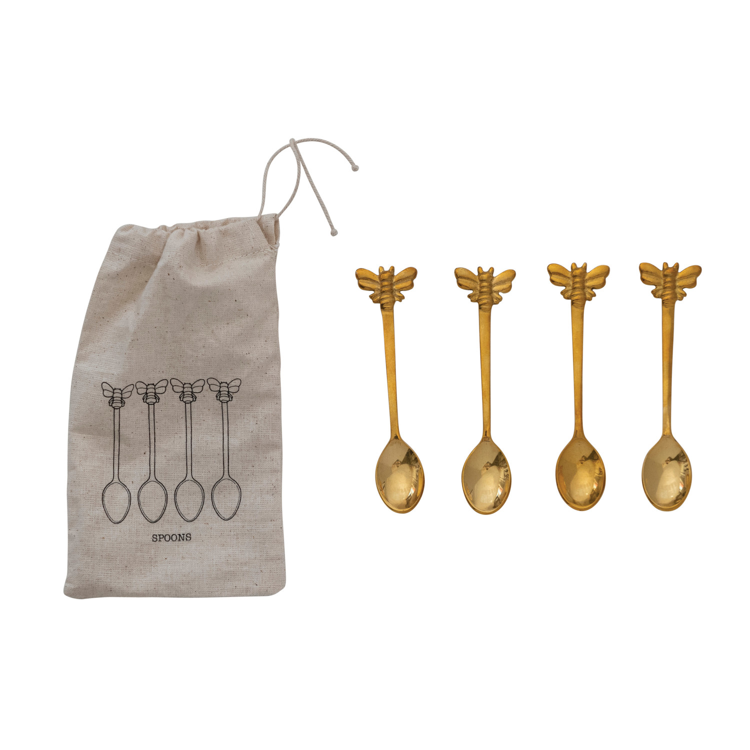 Catalog Name: 4-1/2"L Brass Spoons w/ Bee Handles, Set of 4 in Printed Drawstring Bag