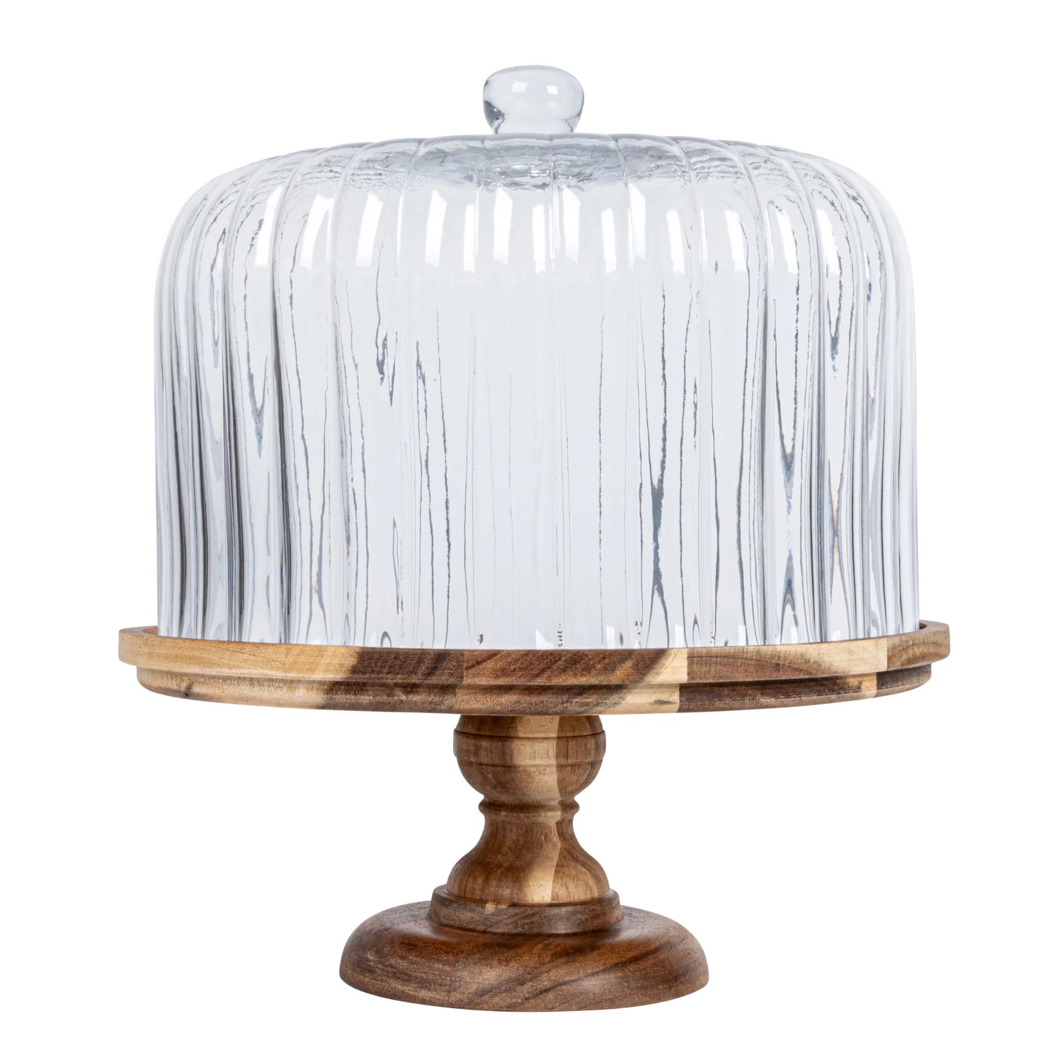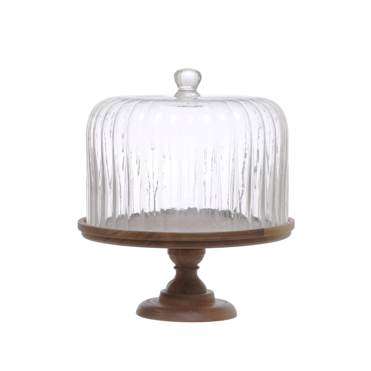 Catalog Name: 12" Round x 13-1/4"H Acacia Wood Pedestal w/ Fluted Glass Cloche, Natural, Set of 2, Truck Ship