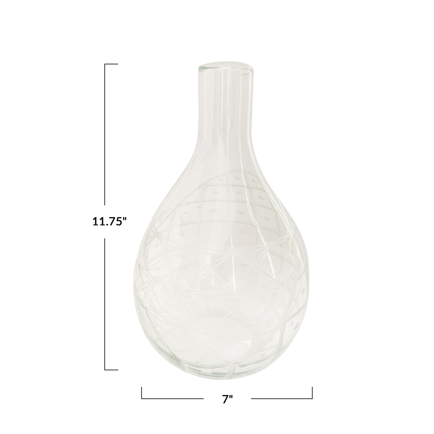 Catalog Name: 7" Round x 11-3/4"H 3-1/2 Quart Hand-Blown Recycled Etched Glass Carafe