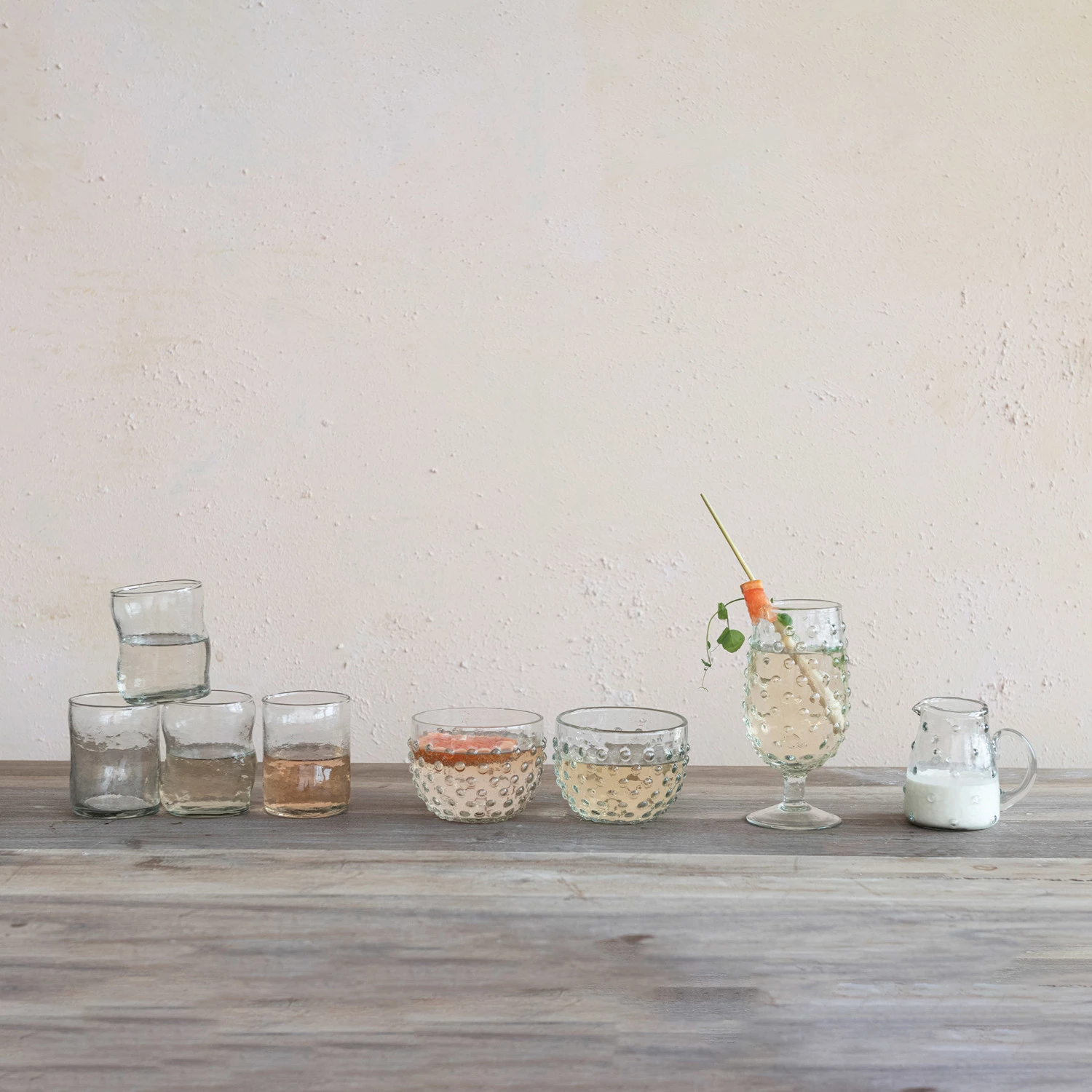 This reclaimed glass hobnail creamer is a charming and versatile serveware piece that can sweeten up any dining or living space. The creamer features a hobnail pattern that creates a subtle sparkle and a spout that makes it easy to pour. The clear glass material is made of reclaimed glass that is eco-friendly and unique. The creamer can be used as a creamer to add some cream to the coffee, tea, or hot chocolate, or as a decorative item to display on a shelf or table. The creamer measures 4 inches in length, 3 inches in width, and 3.75 inches in height, with a capacity of 8 ounces. It is a perfect choice for anyone who loves farmhouse, cottagecore, French country, or coastal style.