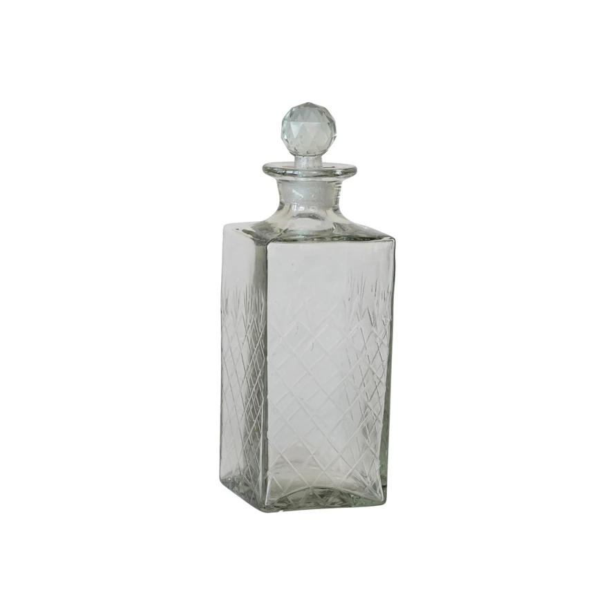 Catalog Name: 3-1/4" Square x 10"H 30 oz. Recycled Etched Glass Decanter w/ Glass Stopper