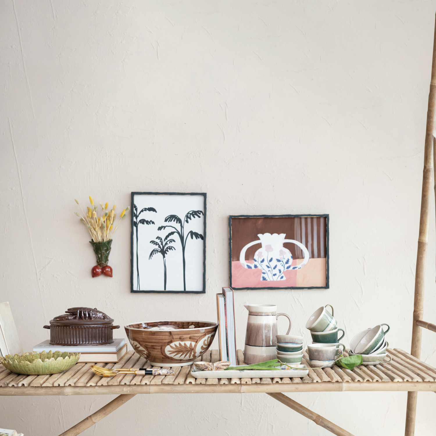 This brown and cream stoneware pitcher with stripes and crackle glaze is a perfect addition to the serveware collection. This pitcher has a cozy and rustic design that features brown and cream stripes that contrast with the white background. The pitcher also has a reactive crackle glaze finish that creates a textured and varied look that makes each pitcher unique and special. The pitcher is made of stoneware, which is a sturdy and durable material that can withstand high temperatures and frequent use. The pitcher can hold up to 64 ounces of liquid and can be used for serving water, juice, tea, or any other beverage. The pitcher can blend with any style, from farmhouse to lodge to cabin to coastal to transitional, and add a warm and inviting touch to the table. The pitcher measures 6.75 inches in length, 5.25 inches in width, and 8.25 inches in height, making it generous enough to serve a large group of guests. Use it for everyday dining or special occasions, this brown and cream stoneware pitcher with stripes and crackle glaze will impress the guests and enhance the beverage presentation.