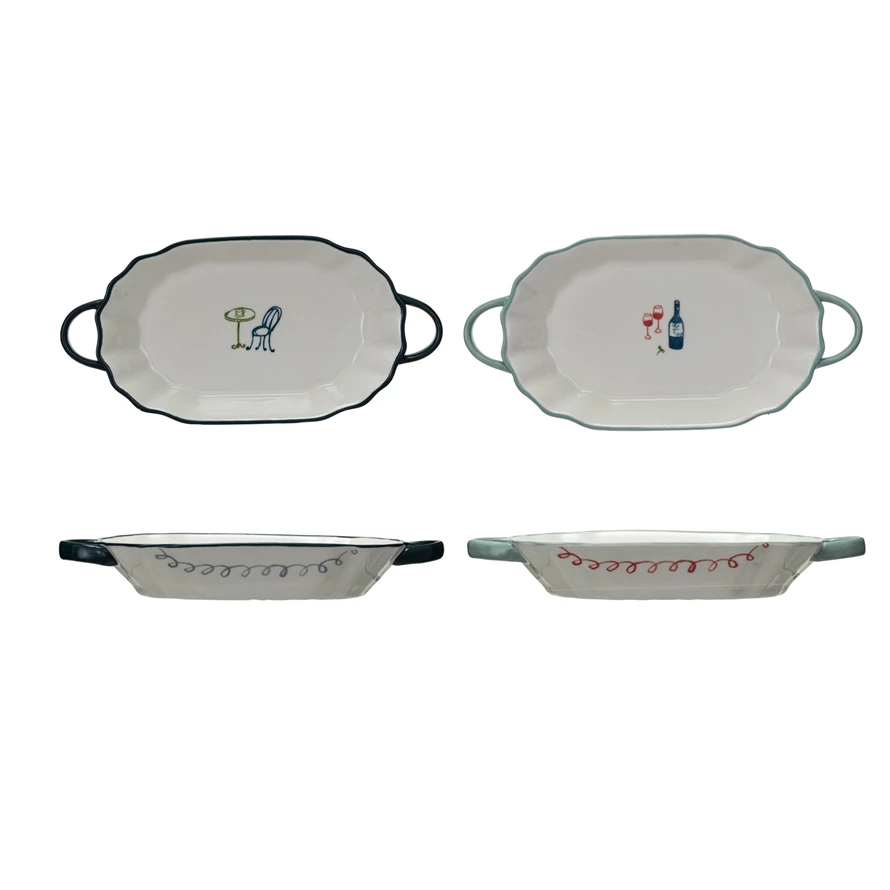 Catalog Name: 9-1/2"L x 4-3/4"W 1 Cup Stoneware Scalloped Casserole Dish w/ Colored Handles & Bistro Image, Multi Color, 2 Styles