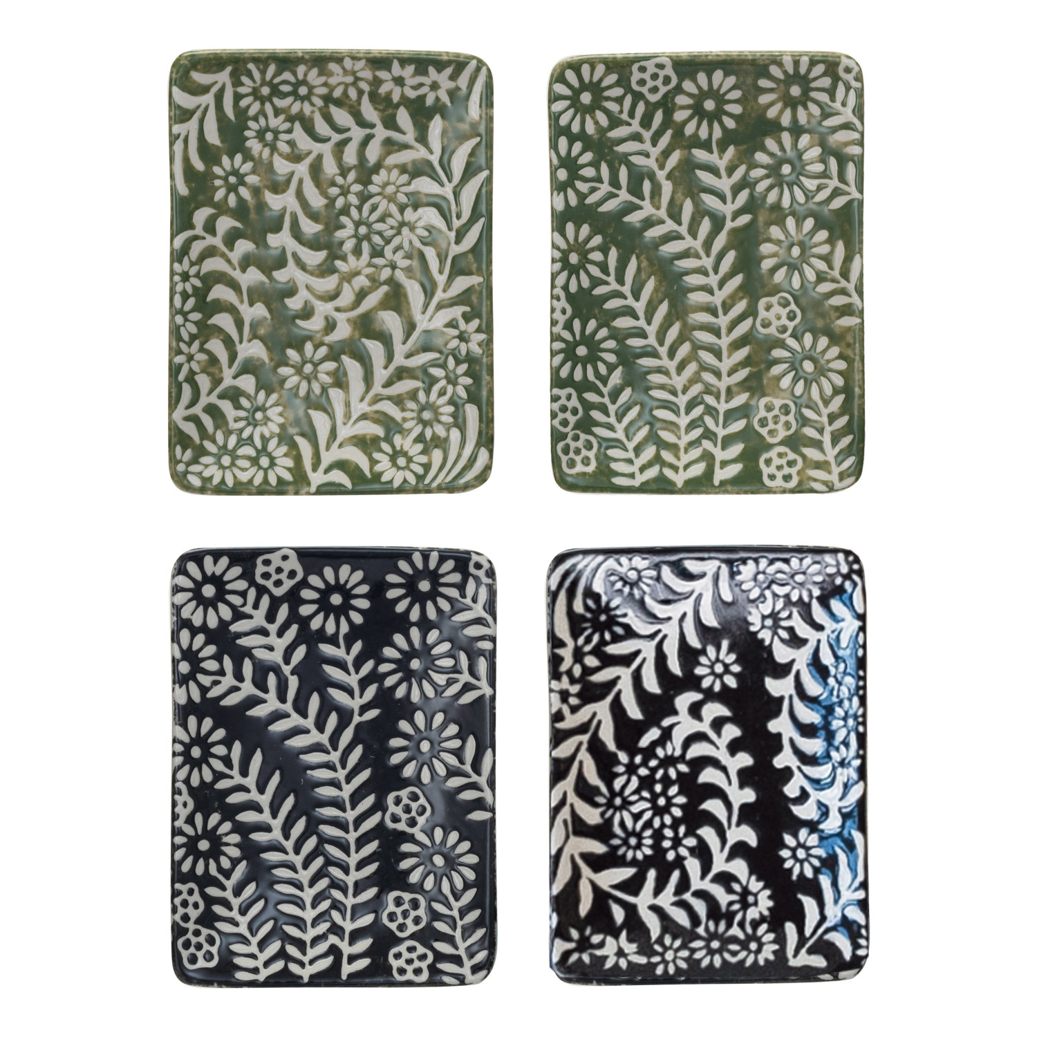 Catalog Name: 4"L x 3"W Stoneware Dish w/ Wax Relief Botanicals, Green, Black & Cream Color, 4 Styles