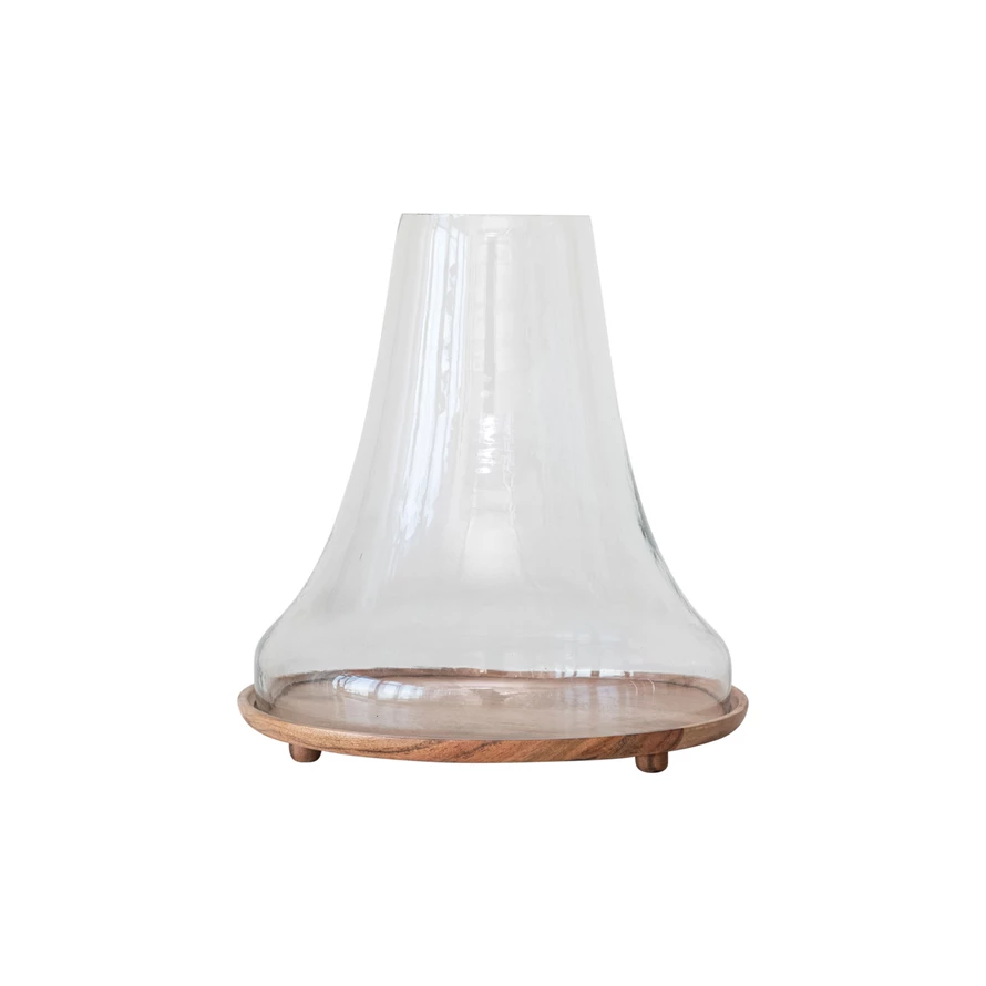Catalog Name: 13" Round x 13"H Recycled Glass Cloche w/ Mango Wood Footed Base, Natural, Set of 2