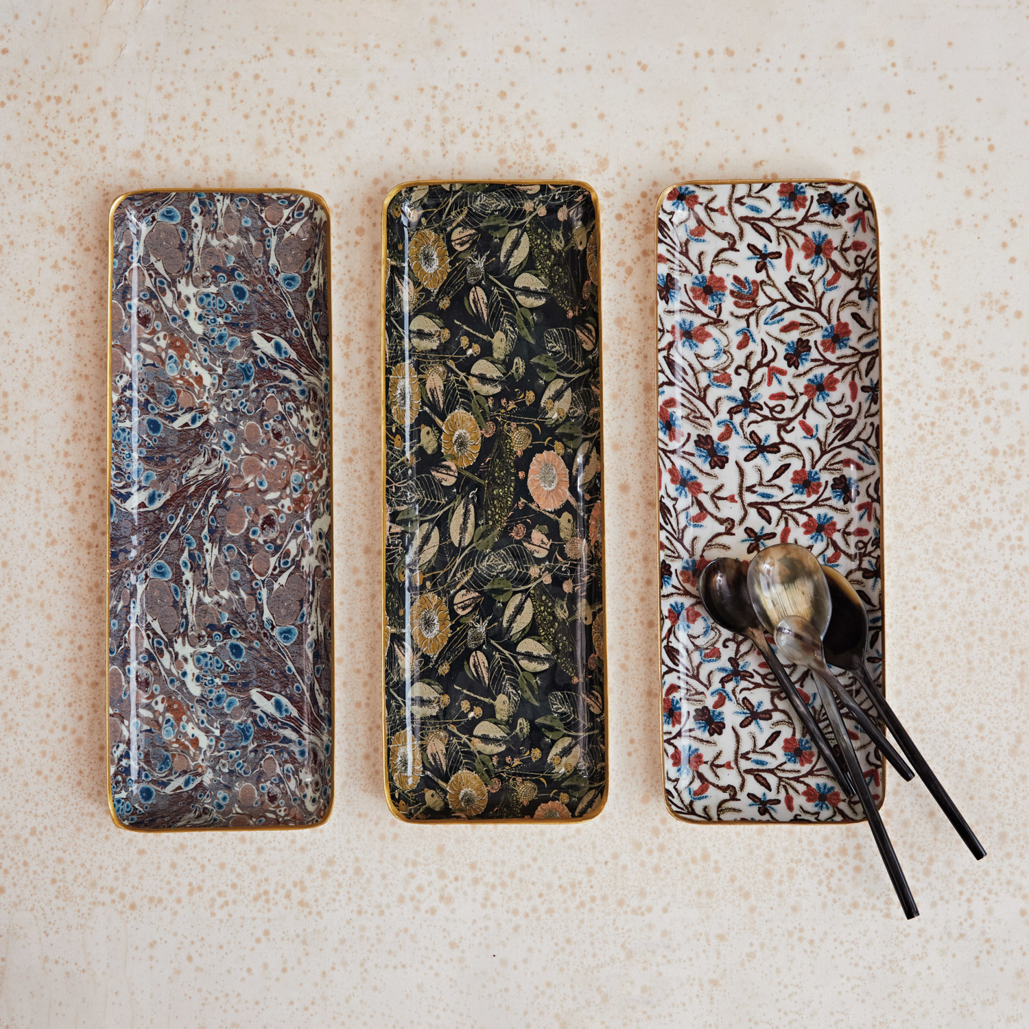 Catalog Name: 13"L x 4-1/2"W Enameled Metal Tray w/ Pattern & Gold Edge, Multi Color, 3 Styles