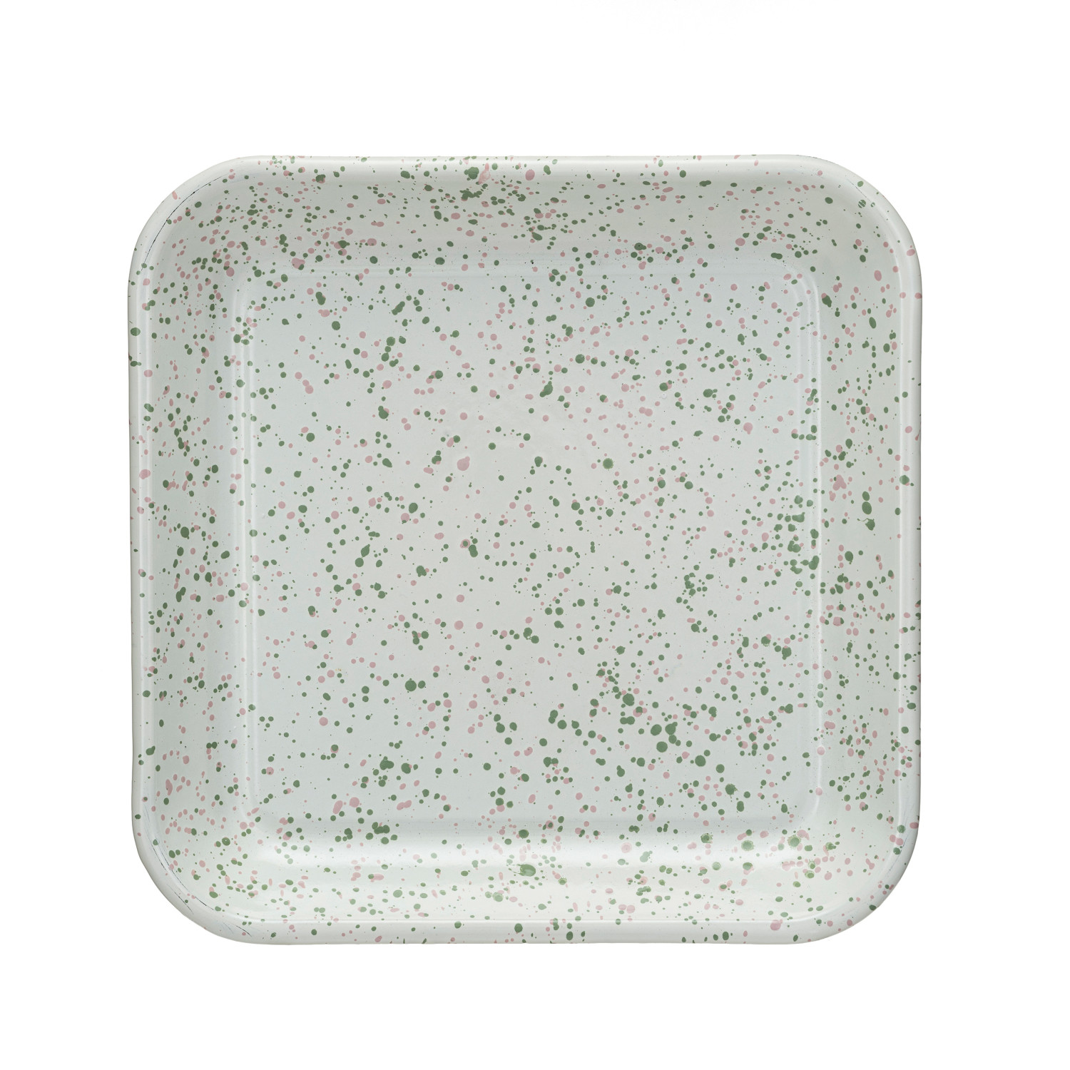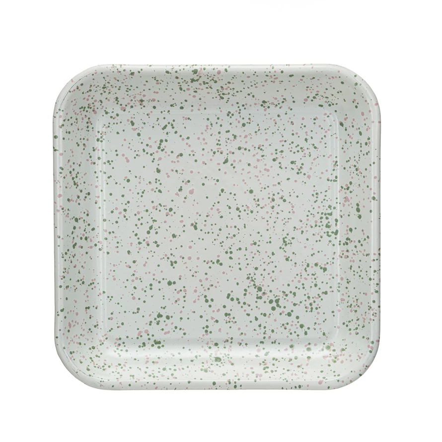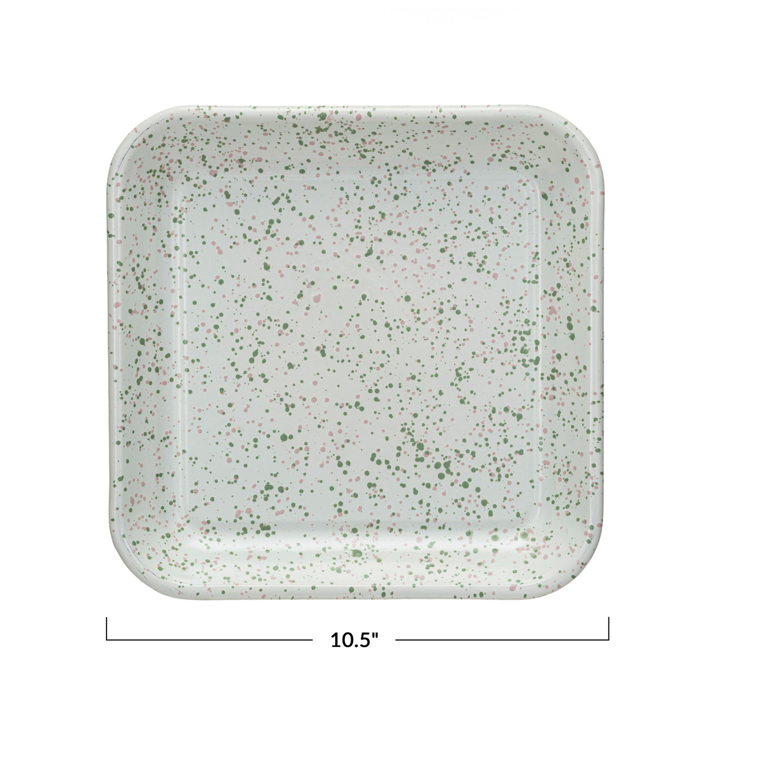 Catalog Name: 10-1/2" Square Enameled Metal Splatterware Platter, Cream Color, Pink & Green