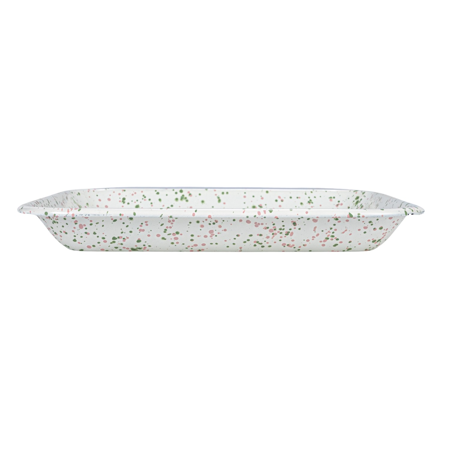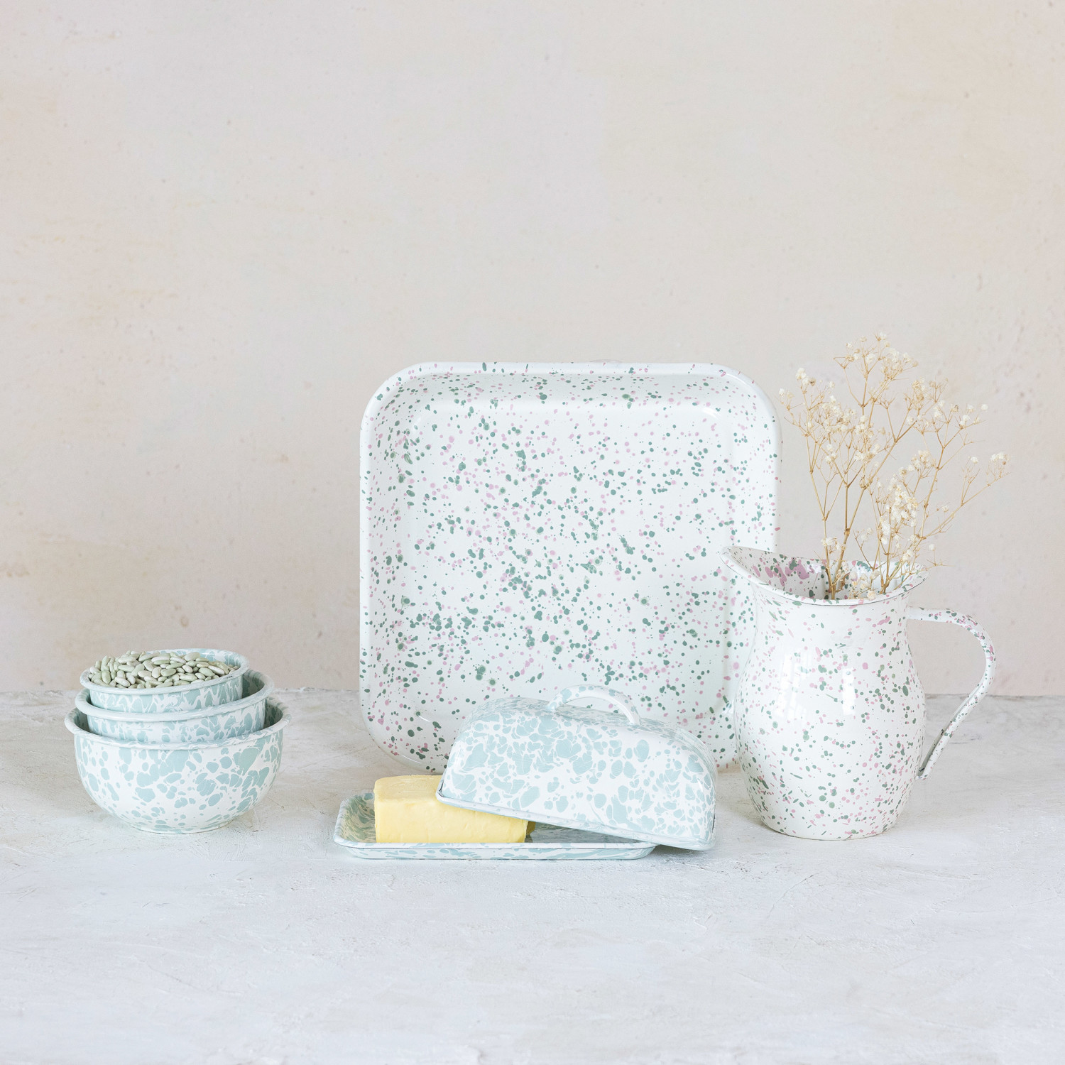 This metal platter is a lovely piece that will bring some nostalgia and style to the home. The platter has a mint-colored enamel coating and a pink and cream splatterware pattern that creates a cheerful and cozy vibe. The platter has a square shape with rounded corners and a raised rim. It is made of durable metal with a smooth enamel coating that protects it from scratches and stains. Use this platter to serve guests, or to decorate the kitchen, dining room, or living room. This platter is a unique and lovely item that will enhance any space. This is a beautiful and fun piece that will add beauty and freshness to the table and kitchen serving.