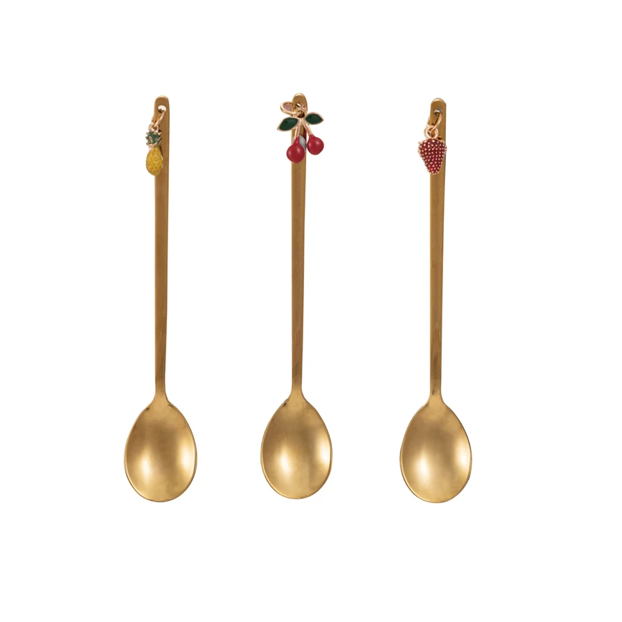 Catalog Name: 5-1/4"L Stainless Steel Spoon w/ Enameled Cherry/Pineapple/Strawberry Charm, Brass Finish, Multi Color, 3 Styles