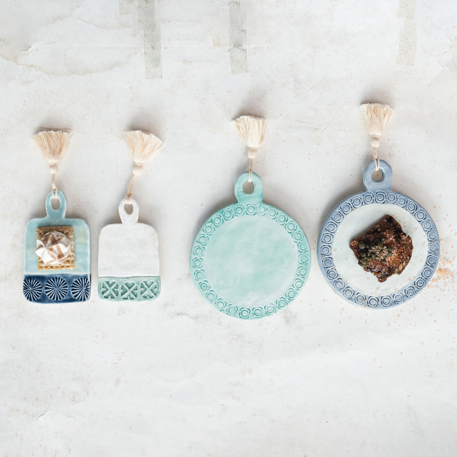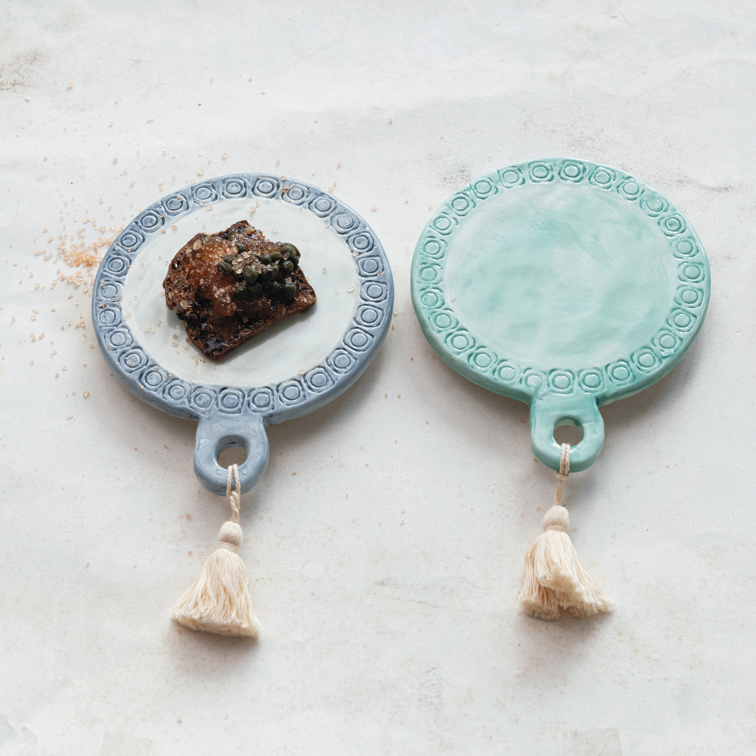 Catalog Name: 6-1/2"L x 5-1/4"W Hand-Painted Debossed Stoneware Mini Tapas Board w/ Tassel, Multi Color, 2 Styles (Each One Will Vary) ©