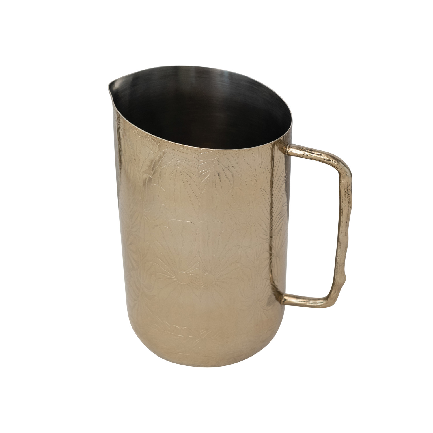 Catalog Name: 7-1/2"L x 5"W x 8-1/4"H 2 Quart Stainless Steel Pitcher w/ Etched Flowers & Brass Twig Shaped Handle