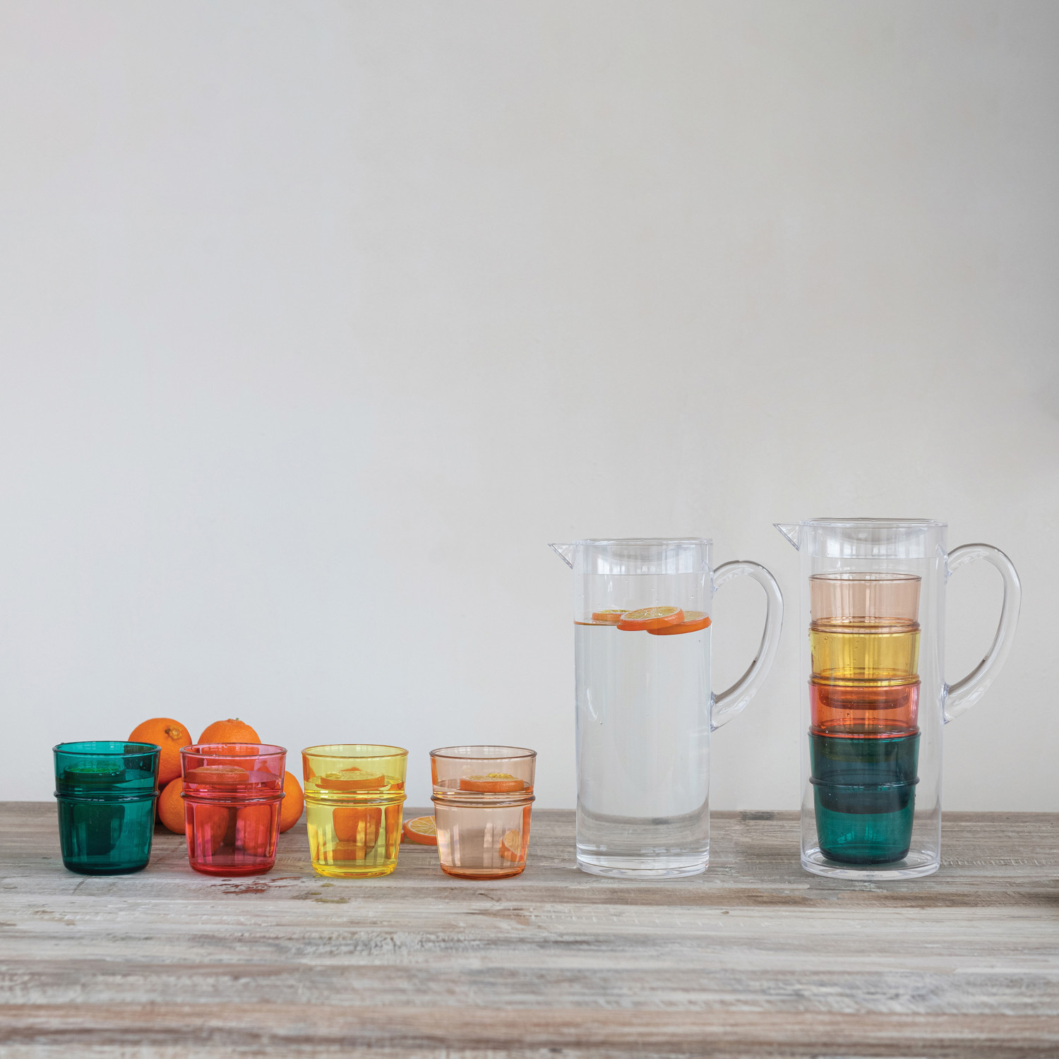 Catalog Name: 7-3/4"L x 4-1/2"W x 10-3/4"H 2 Quart Acrylic Pitcher w/ (4) 3-1/2" Round x 3"H 12 oz. Acrylic Stackable Drinking Glasses, Multi Color, Set of 5
