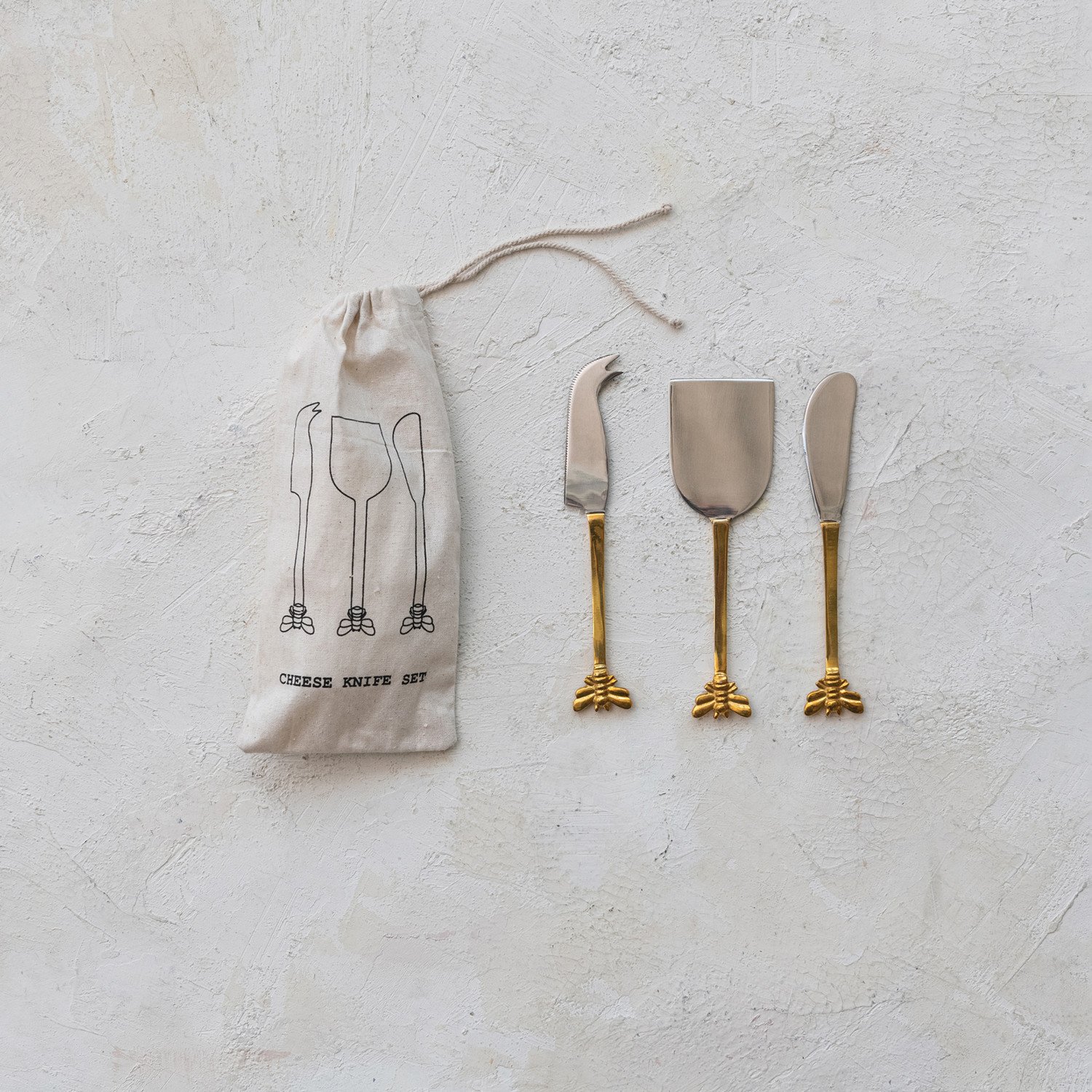 Catalog Name: 6-1/2"L Stainless Steel & Brass Cheese Knives w/ Gold Finish Bee Handles, Set of 3 in Printed Drawstring Bag