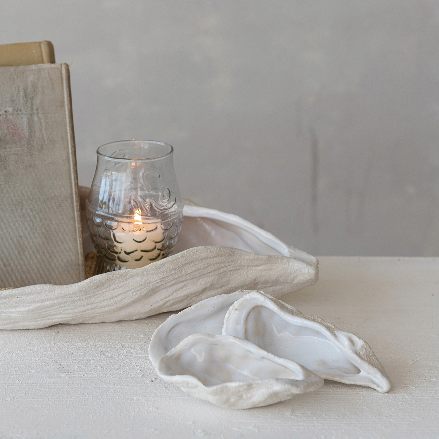 Catalog Name: 4"L - 5-1/2"L Stoneware Oyster Shell Shaped Dish, Reactive Glaze & Unglazed, White, 3 Styles (Each One Will Vary)