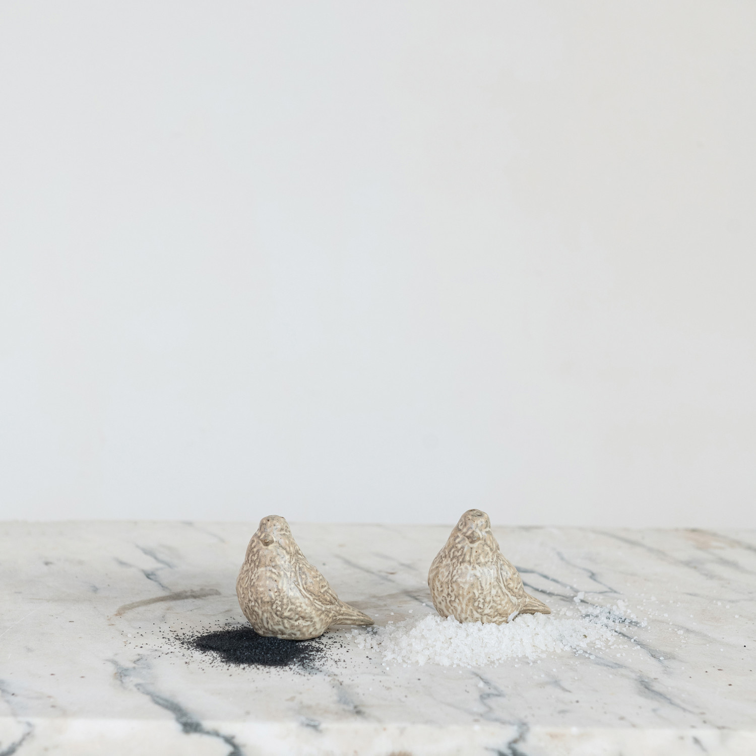 Catalog Name: 2-3/4"L x 1-1/2"W x 2-1/4"H Debossed Stoneware Bird Salt & Pepper Shakers, Reactive Glaze, Tan Color, Set of 2 (Each One Will Vary)