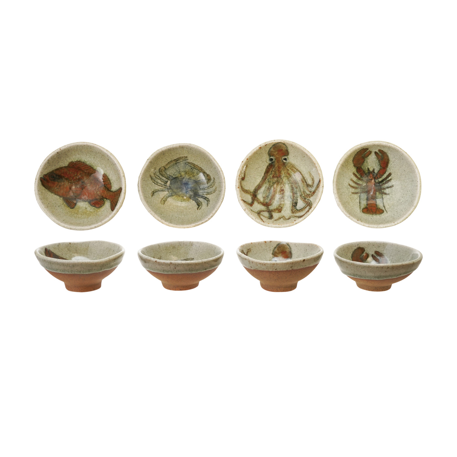 Catalog Name: 3-3/4" Round Hand-Painted Stoneware Dish w/ Sea Life, Reactive Crackle Glaze, Multi Color, 4 Styles (Each One Will Vary)