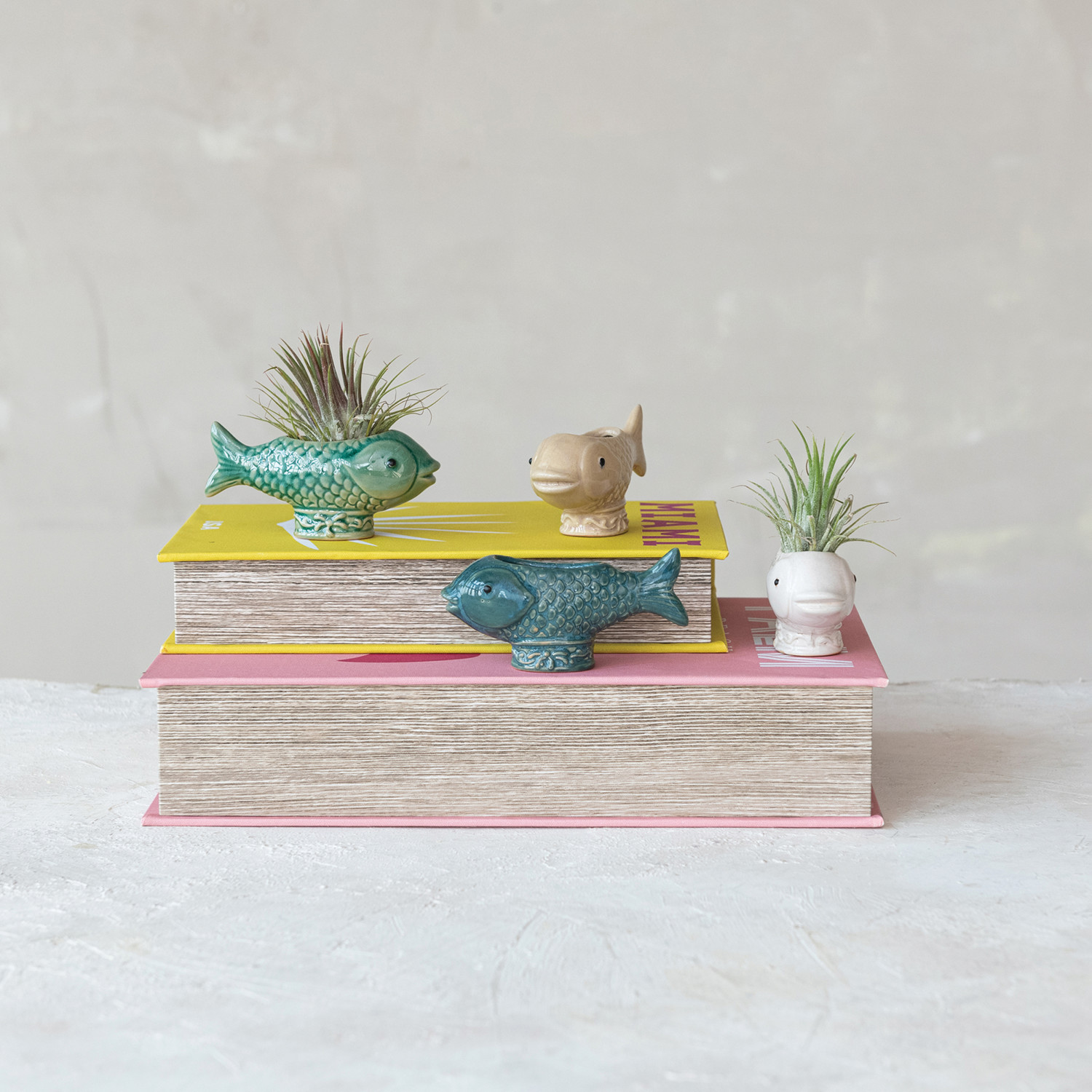 Catalog Name: 4-1/2"L x 1-1/2"W x 2"H Stoneware Footed Fish Shaped Container/Toothpick Holder, Reactive Glaze, 4 Colors (Each One Will Vary)