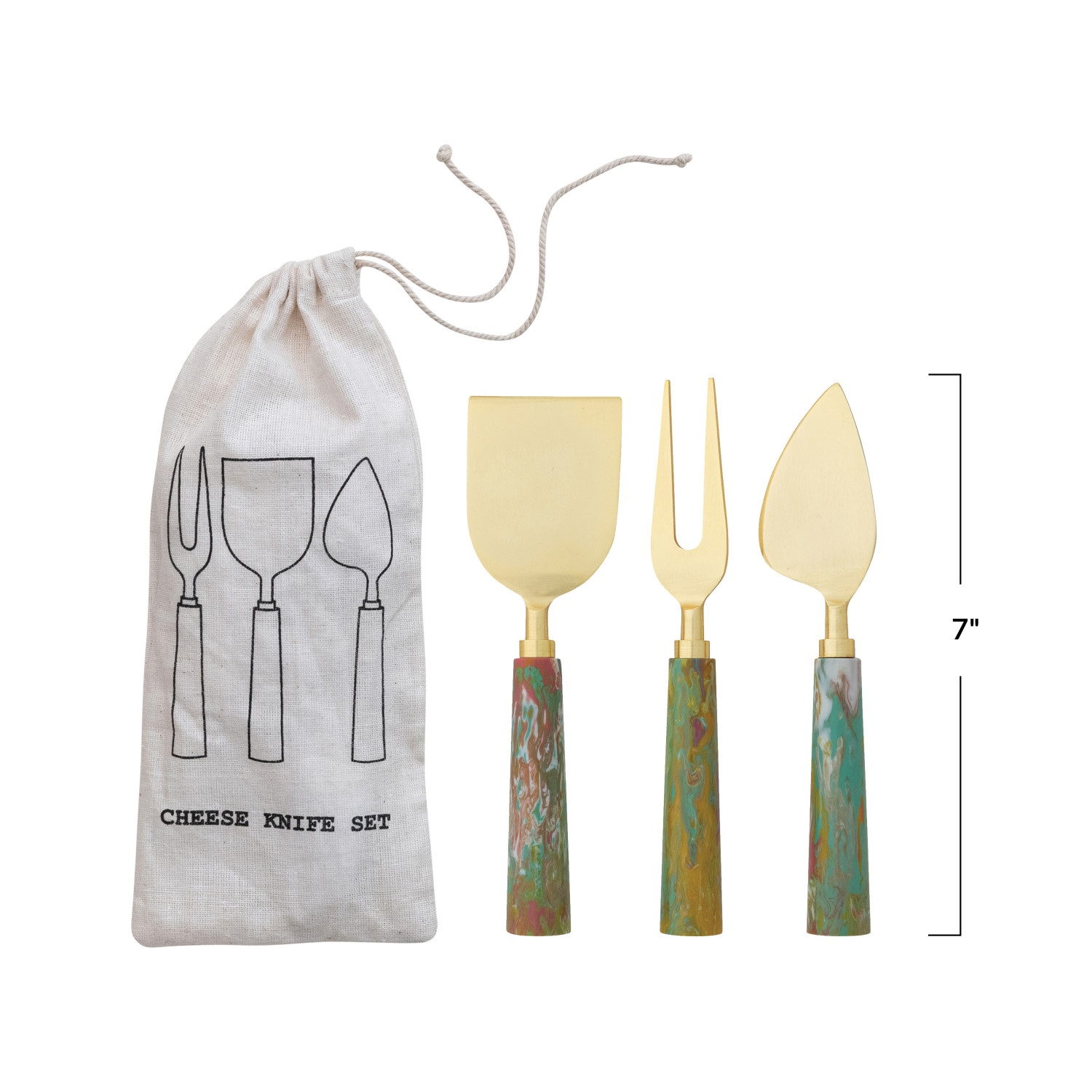 Catalog Name: 7"L Stainless Steel Cheese Knives w/ Marbled Resin Handles, Gold Finish & Multi Color, Set of 3 in Printed Drawstring Bag (Each One Will Vary)