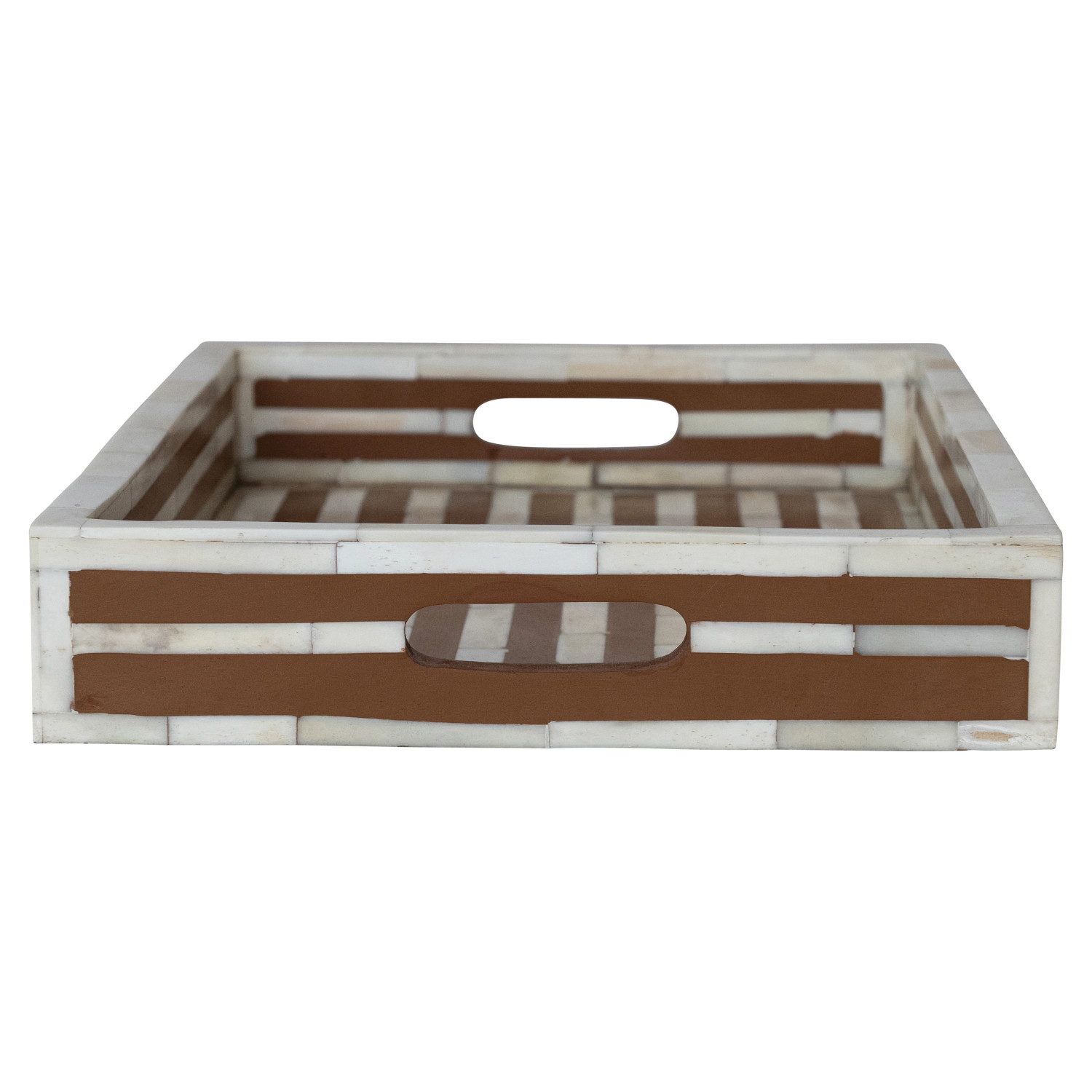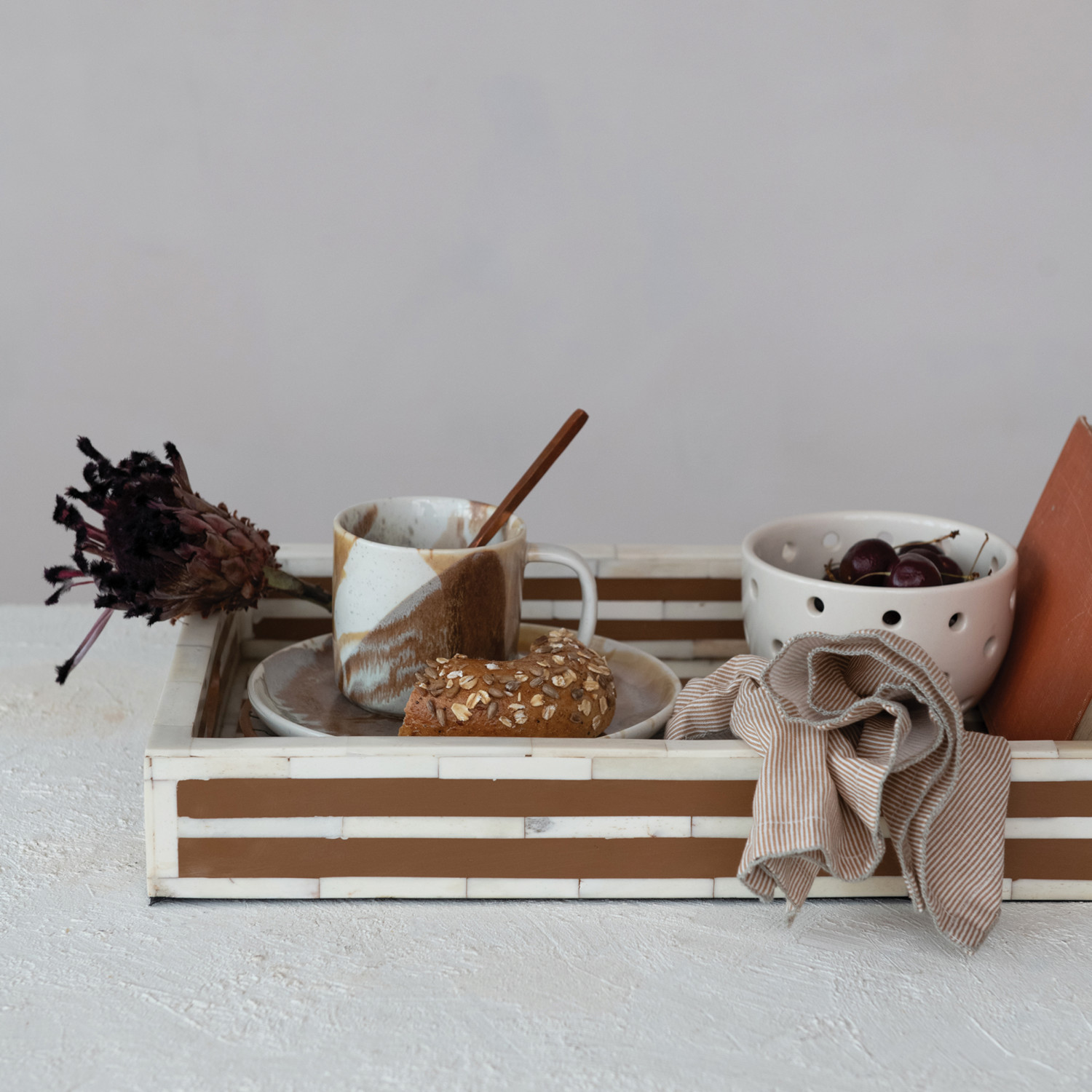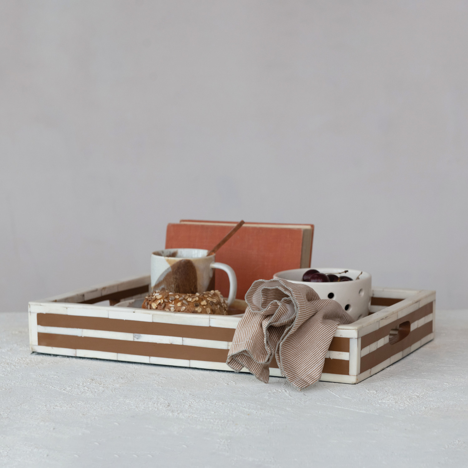 Bone & Resin Inlaid Tray w/ Handles, Brown & Cream Color (Each One Will Vary)